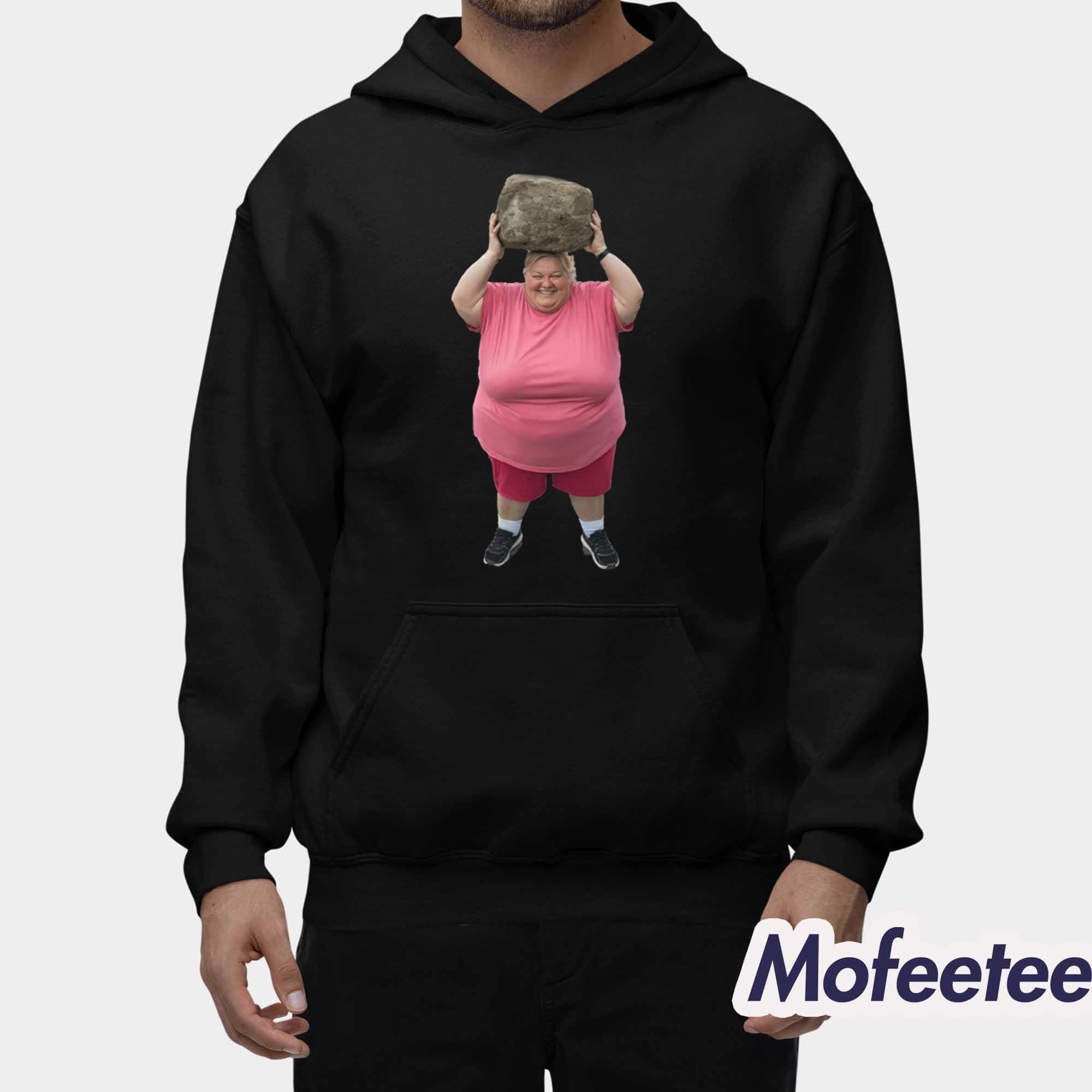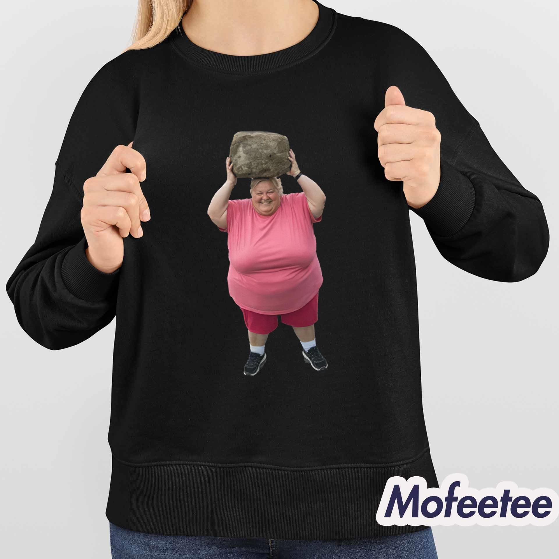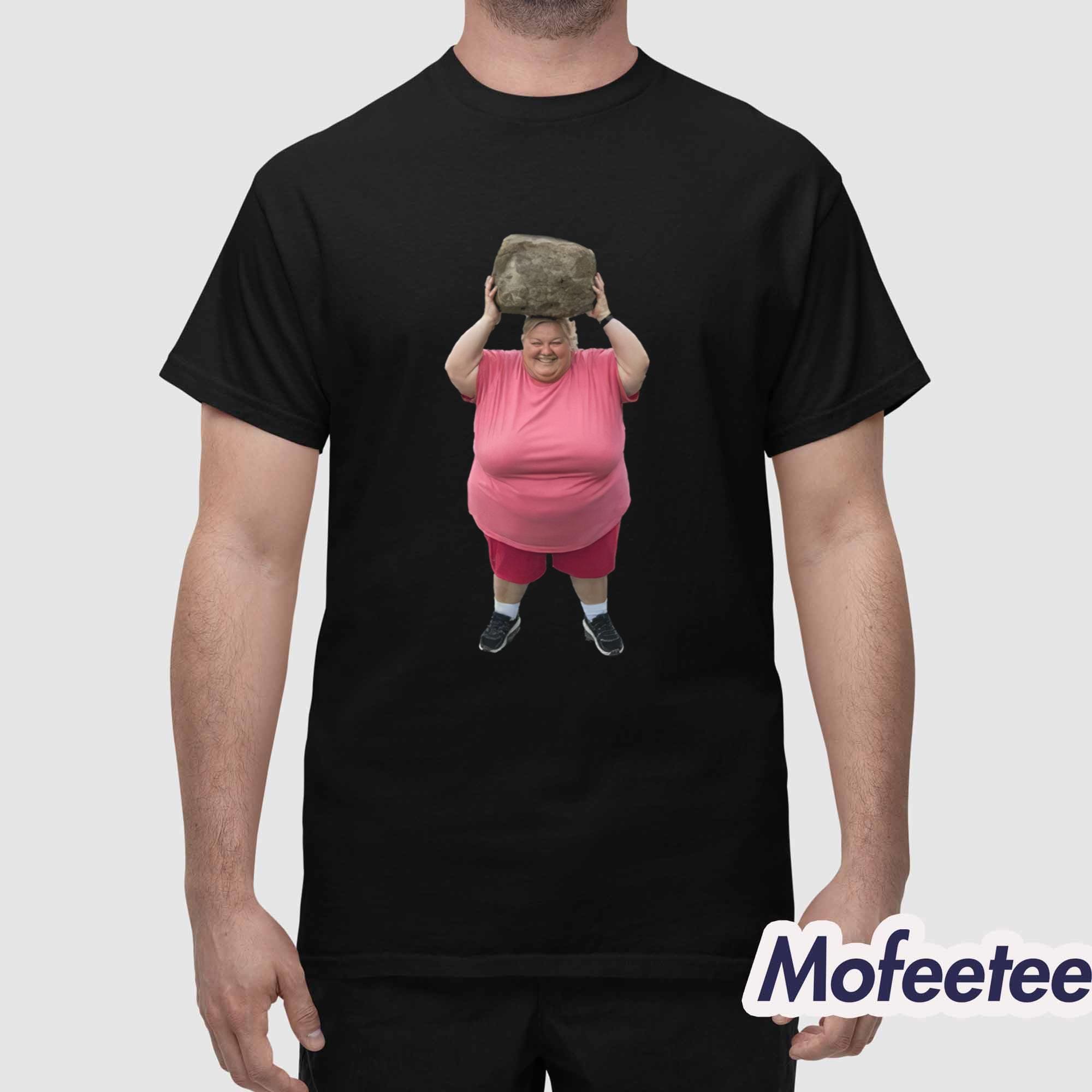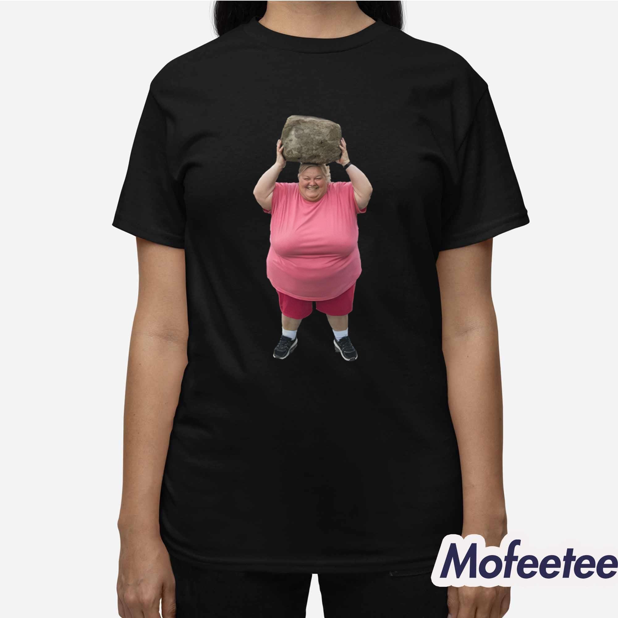At the center of the shirt is the playful and amusing image of a cheerful woman in a bright pink outfit holding a large rock above her head. This humorous artwork, inspired by AI creativity, adds a touch of surreal fun that turns the shirt into both a fashion piece and a talking point. The vibrant colors and high-quality print ensure the design remains sharp and vivid wash after wash.
