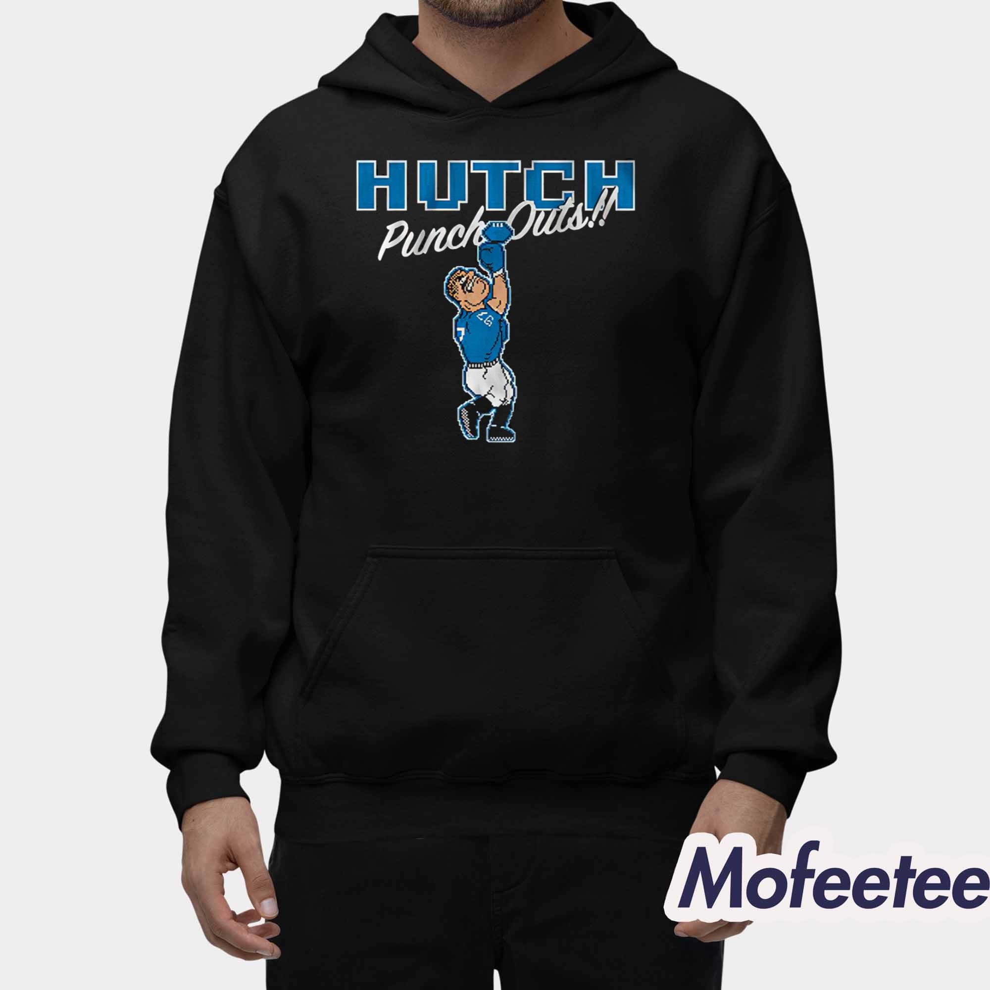 The shirt features a striking design that captures Aidan Hutchinson in action. The graphic showcases him mid-play, delivering a powerful punch, representing both his football skills and his indomitable spirit. The iconic image is paired with bold text, “HUTCH Punch-Outs!!,” creating a playful yet fierce vibe perfect for any fan of the Detroit Lions or the sport of football.