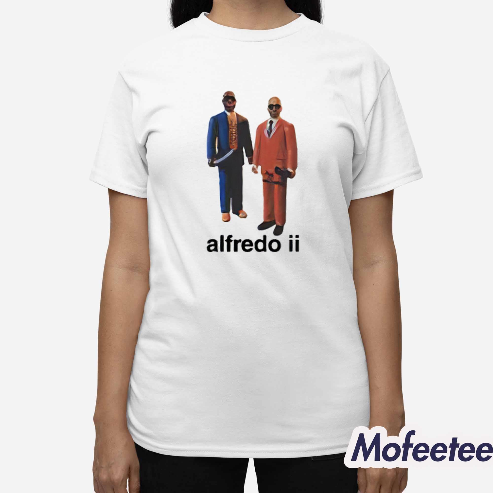 The shirt is crafted from high-quality, soft cotton that ensures comfort and breathability throughout the day. The design features two Alfredo II action figures, one dressed in a blue suit and the other in an orange suit, making a playful and fashionable impact. The black text “alfredo ii” below the figures adds a simple yet stylish finishing touch.