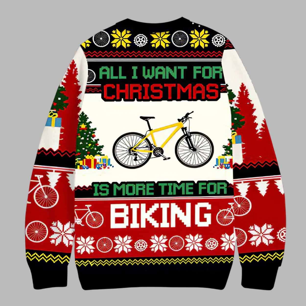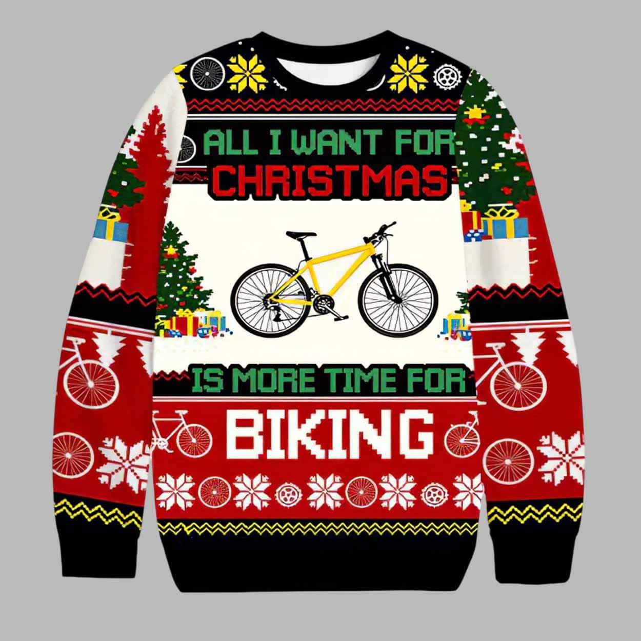 If you’re a cycling enthusiast who loves the holiday season, the All I Want For Christmas Is More Time For Biking Ugly Christmas Sweater is the perfect addition to your festive wardrobe. Featuring a clever design that combines your love for biking with the holiday spirit, this sweater is a fun and unique way to show off your passion for cycling while celebrating Christmas.