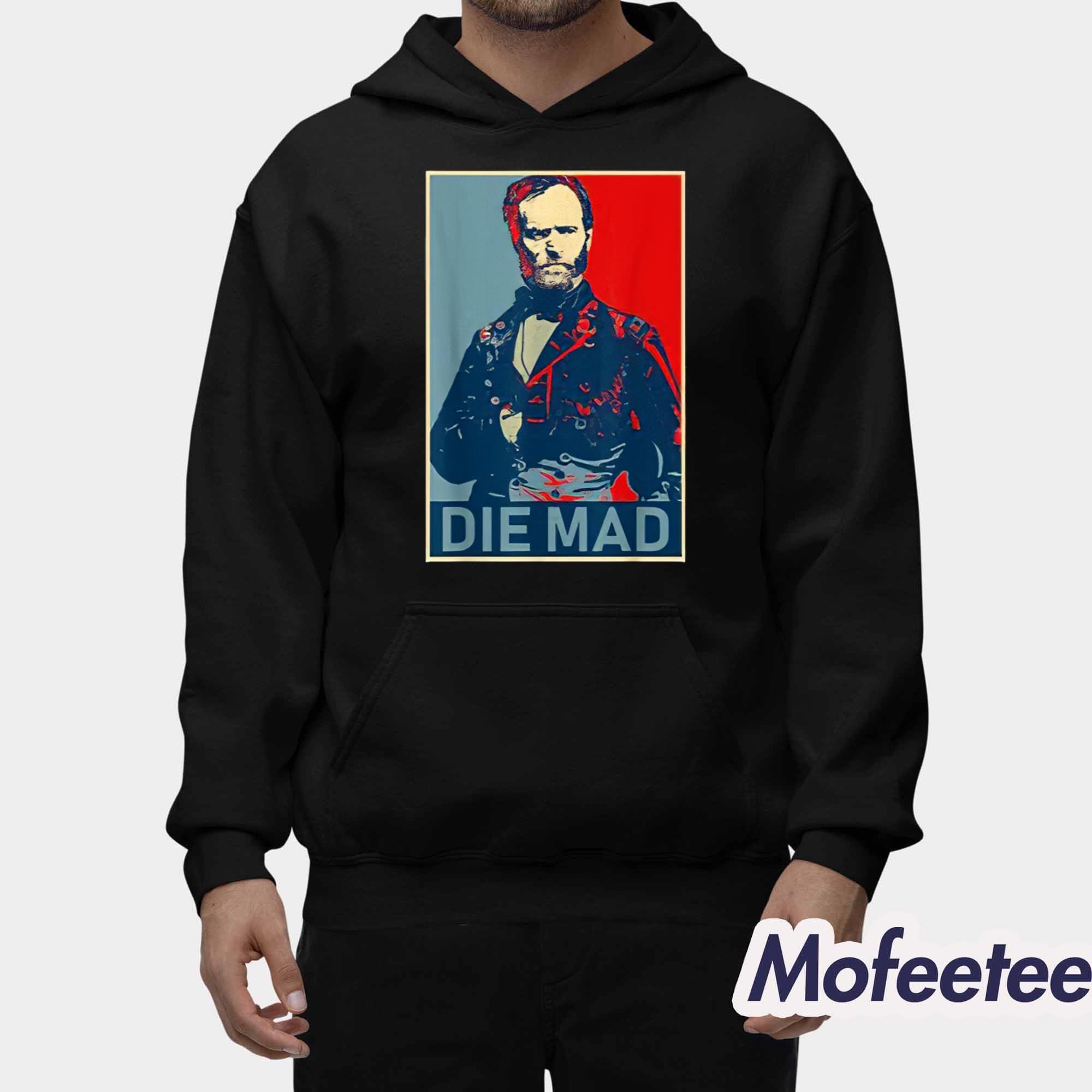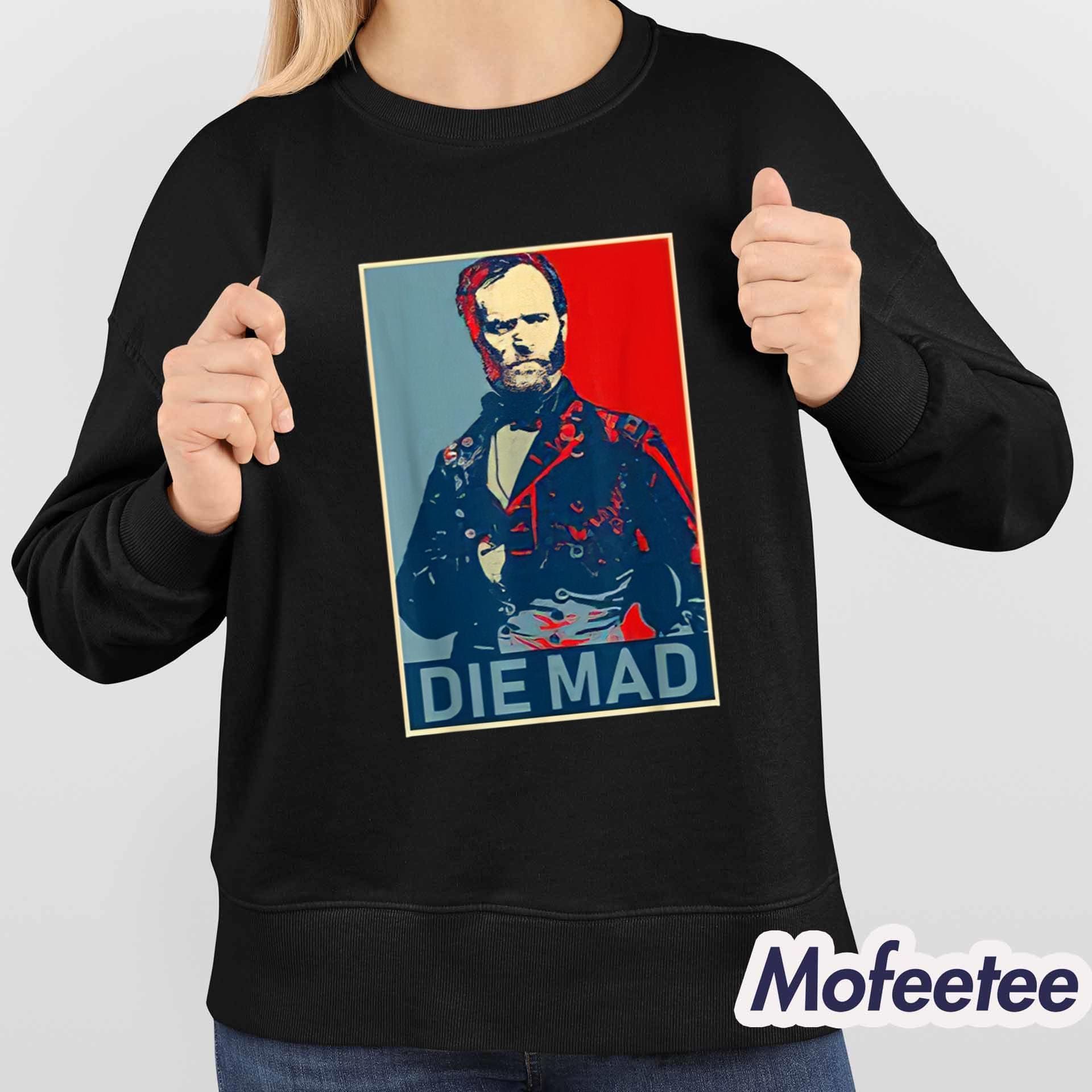 The shirt features a commanding illustration of General Sherman, styled in a bold red, white, and blue poster design with the words “DIE MAD” printed across the bottom. The artwork recalls iconic political campaign imagery but twists it into something witty and fierce — a perfect mix of intellect, irony, and rebellion. Whether you’re into history, satire, or just enjoy a powerful visual punch, this shirt is a conversation starter wherever you go.