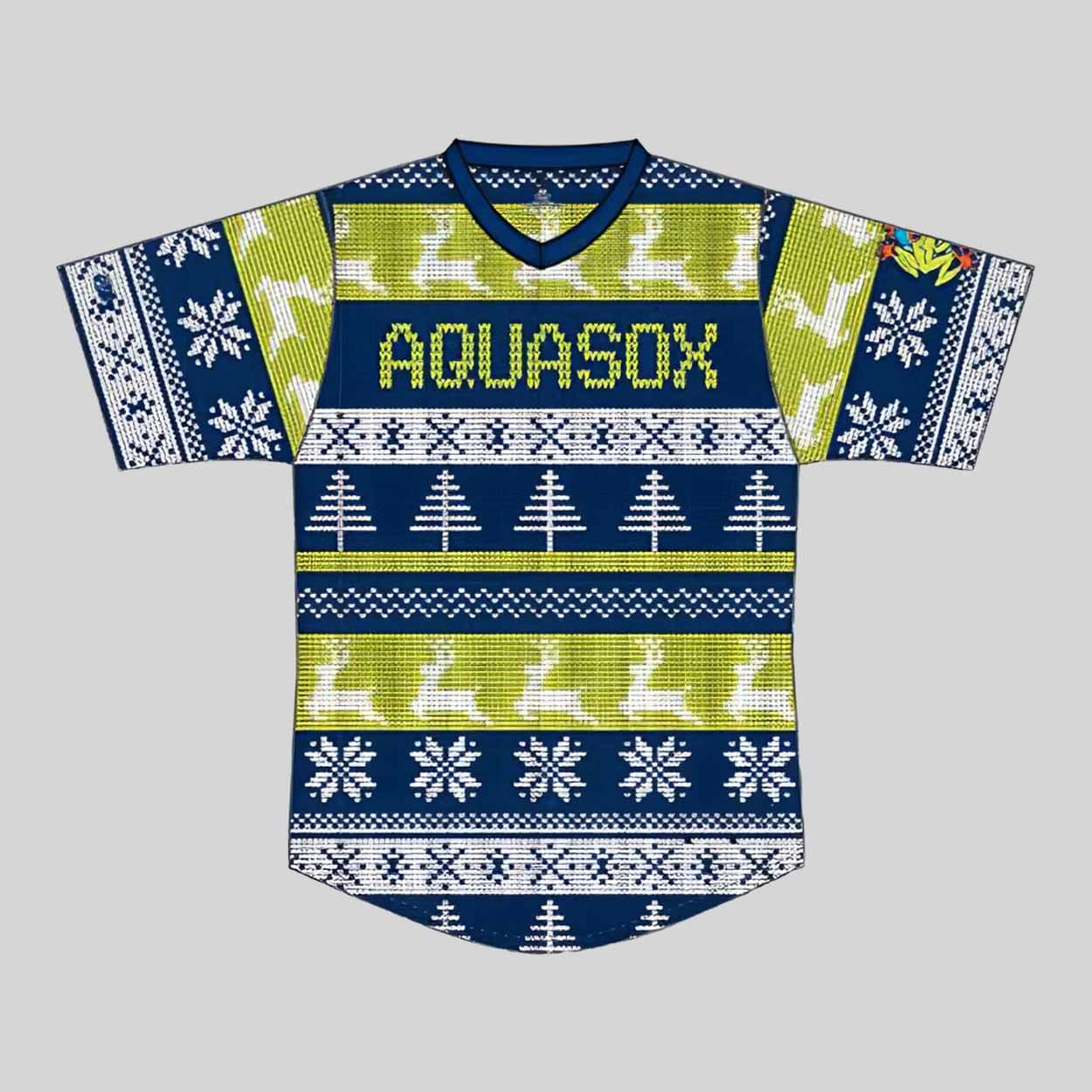 The jersey 2025 giveaway is a showstopper designed to bring a smile to every fan’s face. Inspired by classic “ugly Christmas sweater” patterns, this vibrant jersey features rows of pixel-style snowflakes, reindeer, evergreen trees, and festive motifs across the front, back, and sleeves. Highlighted in the center is the bold “AQUASOX” wordmark, knitted in a fun cross-stitch style using bright green against a navy blue backdrop.