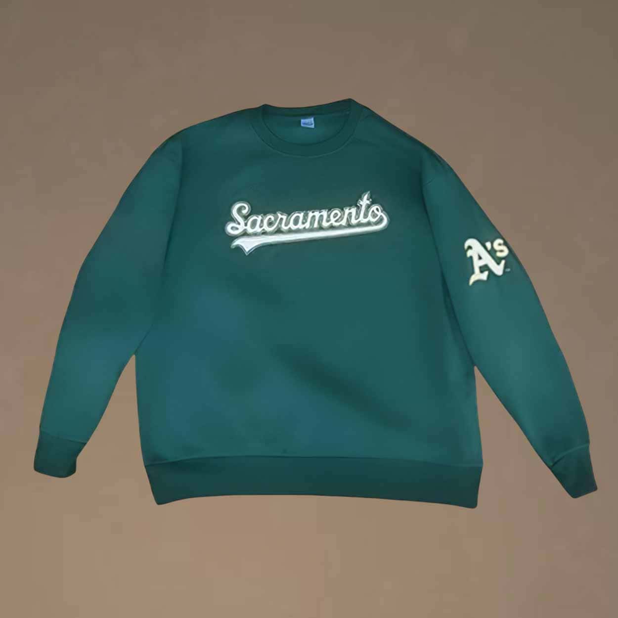 The sweatshirt 2025 giveaway combines classic design with modern comfort. Featuring a deep green base, it proudly displays “Sacramento” across the chest in a clean, script-style font, while the iconic A’s logo on the sleeve reinforces team pride. Its minimalist yet bold design makes it versatile enough to pair with jeans, joggers, or even athletic wear.
