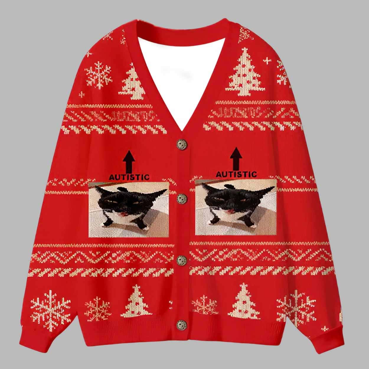The Autistic Cat Ugly Cardigan Sweater is a playful, meme-inspired holiday piece designed for anyone who enjoys internet humor, offbeat style, and cozy festive fashion. With its bright red knit-style pattern, winter icons, and quirky cat graphic, the ugly cardigan sweater brings personality, warmth, and humor together in a way that instantly stands out at any holiday gathering.
