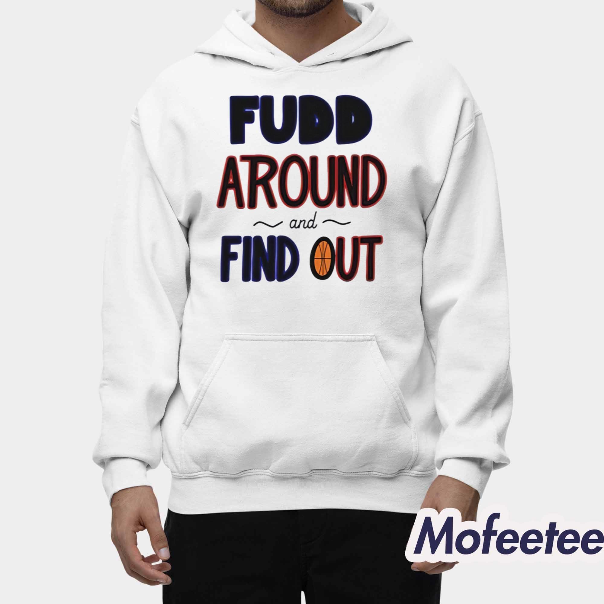 The shirt features the bold phrase “FUDD AROUND AND FIND OUT” along with a basketball graphic, making it both fun and sporty. The design’s combination of red and navy colors pops against the white fabric, giving it a vibrant and energetic look. The classic crewneck design adds versatility, allowing you to pair it with jeans, shorts, or athletic wear.