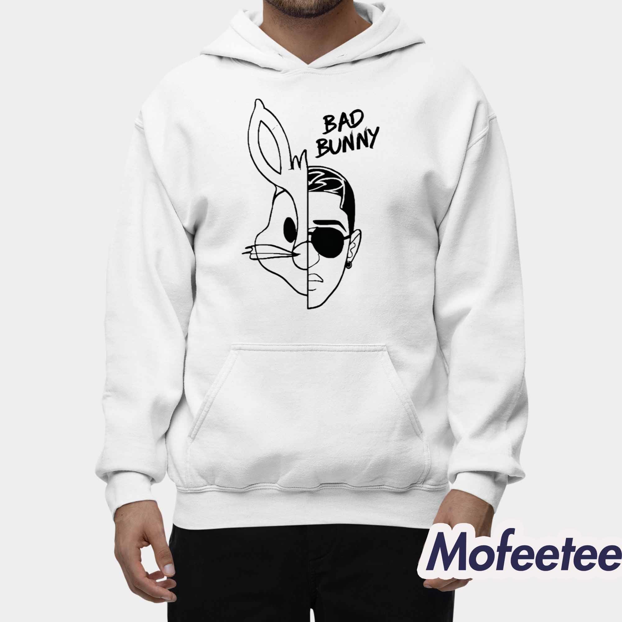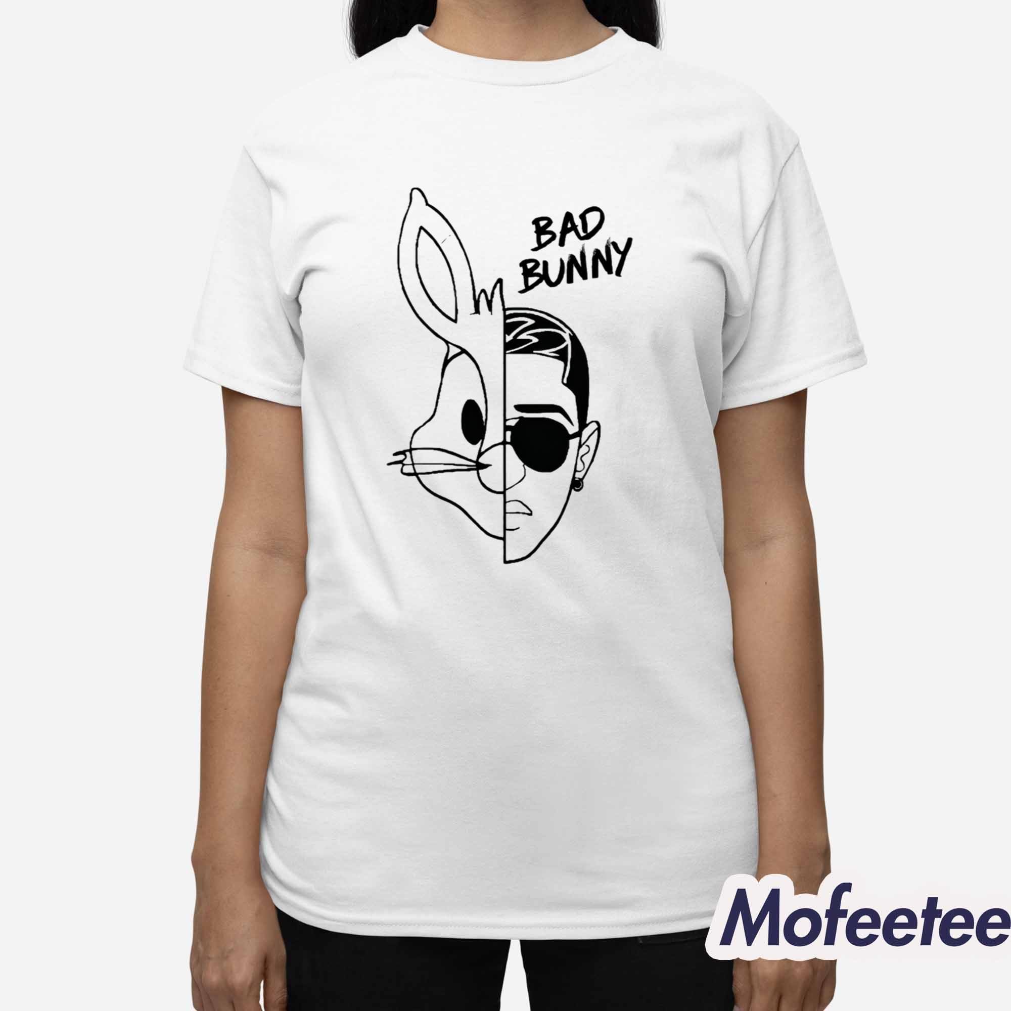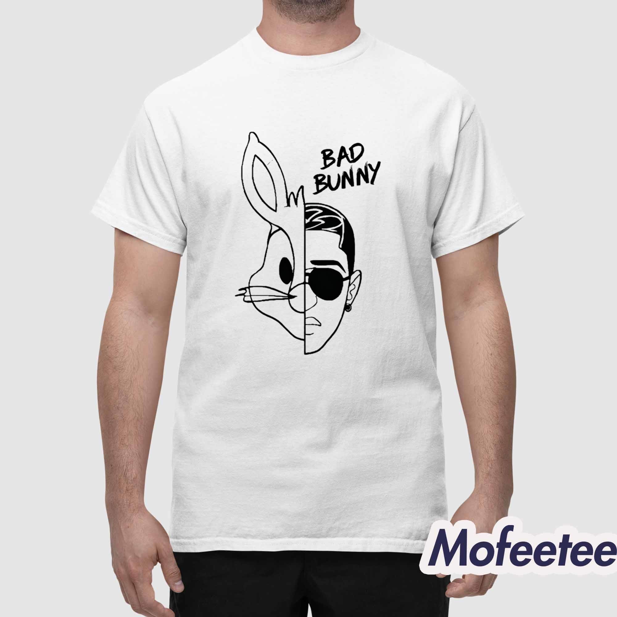 The design features a split graphic that cleverly blends iconic imagery with Bad Bunny’s recognizable look, paired with text that emphasizes his name. The shirt captures the fusion of fun and style, making it more than just a tee—it’s a statement piece. The white shirt base allows the black line art to pop, creating a minimalist yet striking effect that pairs well with any casual outfit.