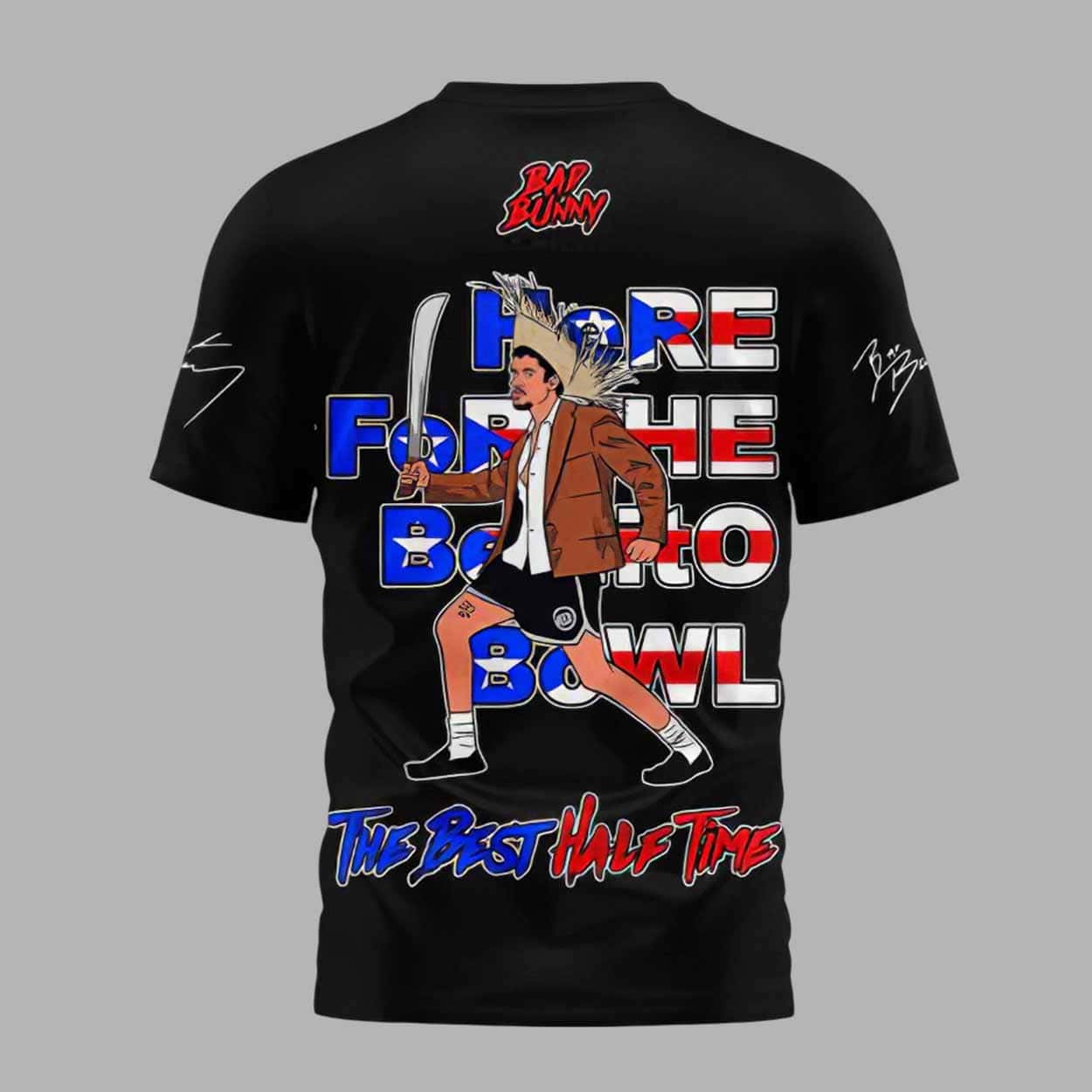 Made from high-quality cotton, the shirt offers maximum comfort and durability for all-day wear. The fabric is soft yet sturdy, perfect for wearing to the game, a party, or just casual outings. The design showcases a vibrant illustration of Bad Bunny sitting with the Super Bowl trophy, with the Puerto Rican flag as the backdrop. On the back, a fun and energetic graphic reads, “Here for the Bowl to Bowl, The Best Half Time,” adding to the playful and sporty vibe of the shirt.