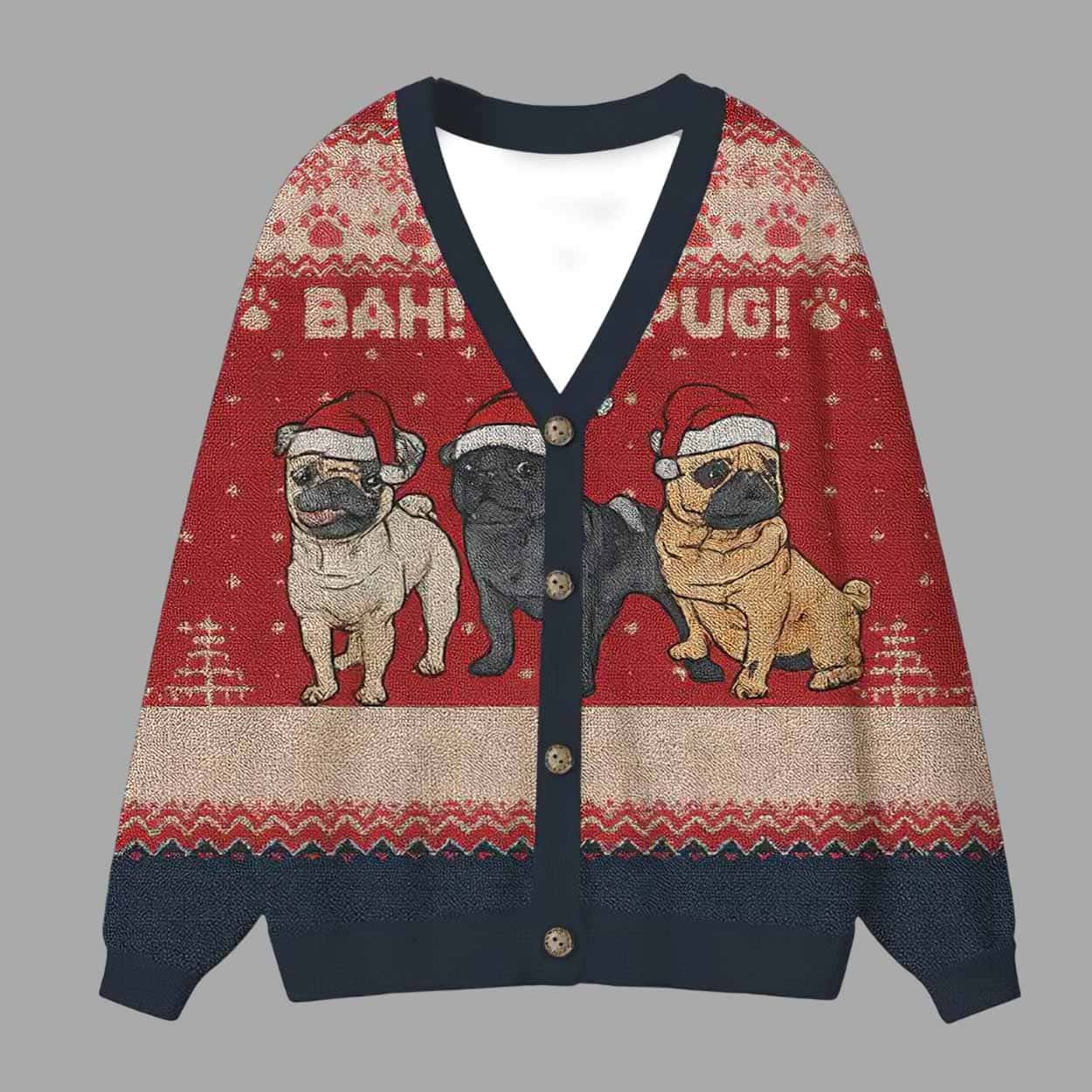 Celebrate the season with a cardigan that speaks directly to dog lovers and holiday enthusiasts alike. This design captures the playful spirit of pugs dressed in Santa hats, paired with the cheeky phrase “Bah! Hum Pug!”—a delightful twist on a classic holiday expression. Cute, funny, and wonderfully festive, this cardigan instantly brightens any occasion while keeping you warm and stylish.