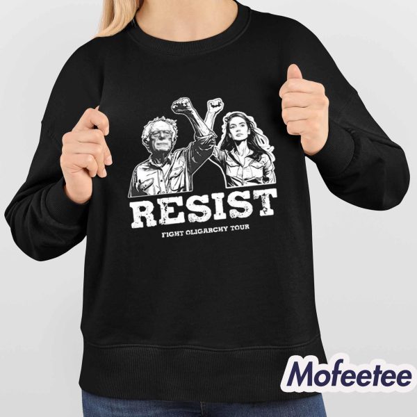 The shirt is more than just apparel—it’s a symbol of resistance and progressive values. The front of the shirt showcases a striking, high-contrast illustration of Bernie Sanders and a powerful female figure raising their fists in unity. Below them, bold distressed lettering reads “RESIST” with the tagline “FIGHT OLIGARCHY TOUR” underneath, making it clear what this movement is all about.