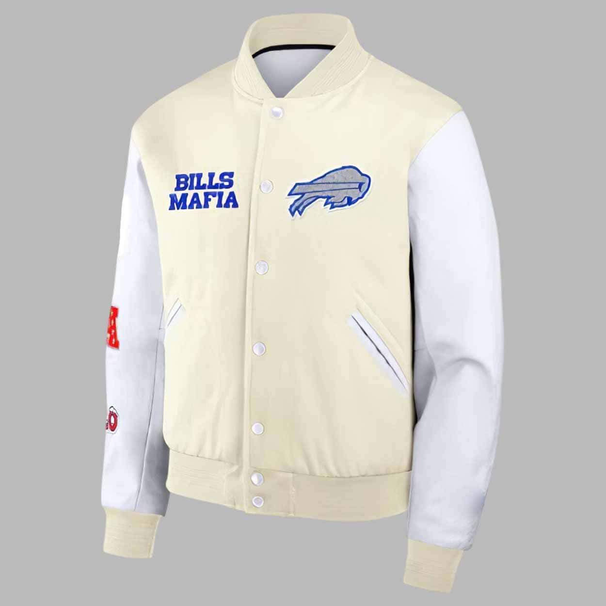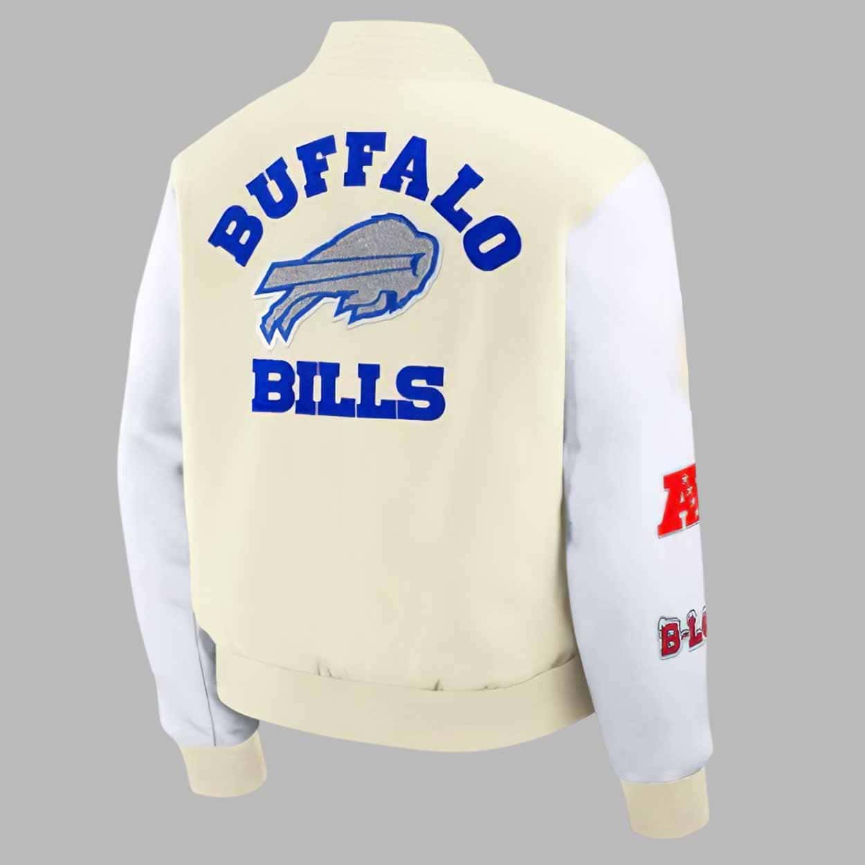 The body of the jacket features a clean cream-beige tone paired with crisp white sleeves, creating a standout contrast that elevates every outfit. Embroidered patches showcase iconic Bills elements, including the bold “BUFFALO BILLS” lettering on the back, a detailed charging Buffalo logo, and “BILLS MAFIA” stitching on the front. Additional rivalry-inspired sleeve details highlight the passion and competition that define every AFC matchup.