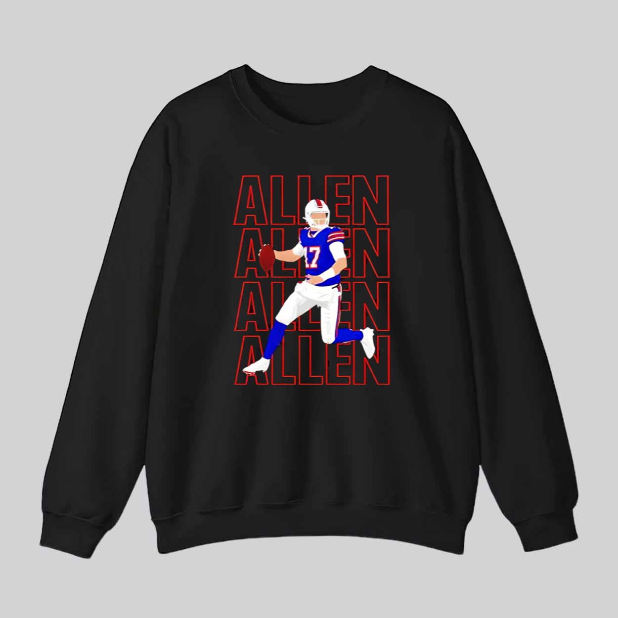 Show off your Bills pride in style with the Bills Josh Allen 17 Allen Allen Allen Allen Shirt. This bold and dynamic design celebrates Buffalo’s star quarterback with a fun repetition of his name, creating a statement piece every fan will love. Whether you’re at the stadium, watching from home, or simply representing your team around town, this shirt is built for comfort and passion.