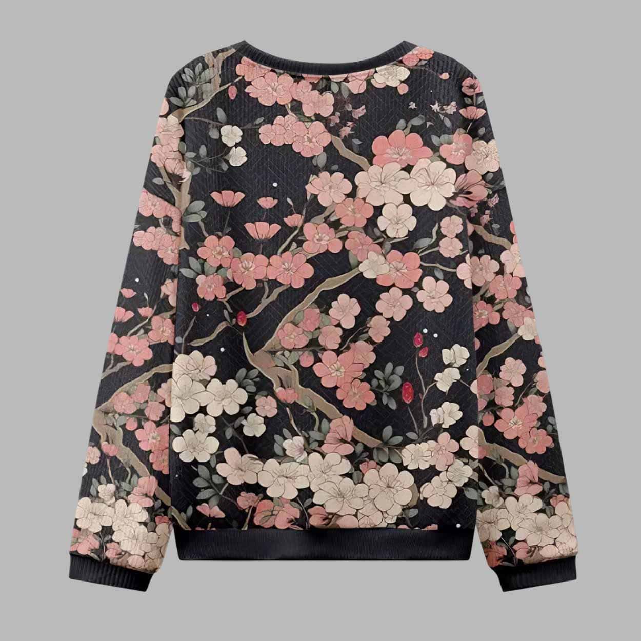 This beautiful sweater features a stunning all-over print of soft pink and cream sakura (cherry blossoms) blooming across dark branches, set against a deep charcoal background. The intricate floral pattern evokes a feeling of peace and renewal—ideal for the winter season. While most Christmas sweaters lean on flashy colors and bold designs, this one takes a refined approach, offering elegance without losing its festive soul.