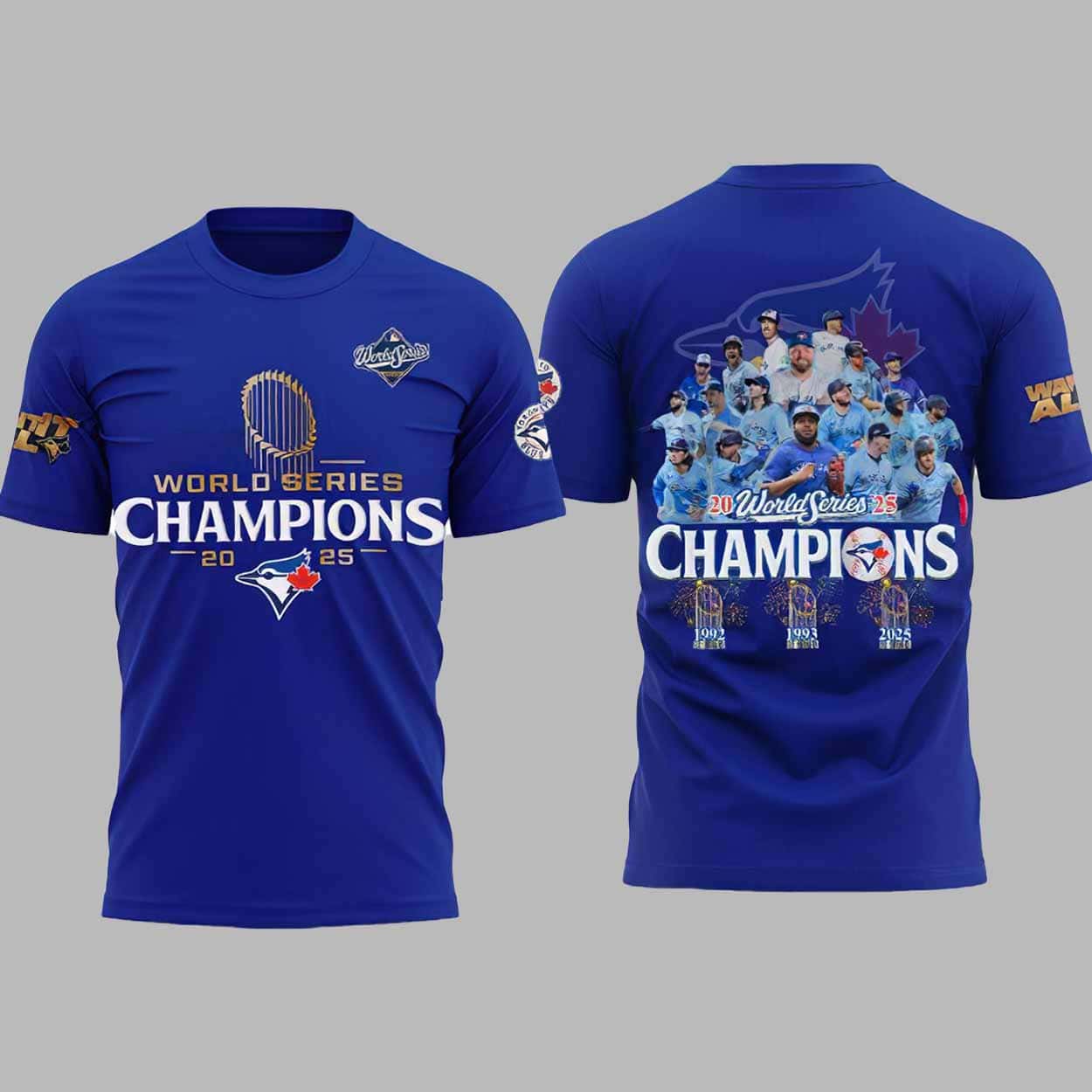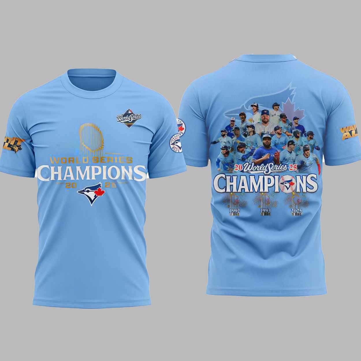 The shirt perfectly commemorates this incredible victory with a dynamic design that highlights the championship moment. The front features a golden trophy graphic with “World Series Champions 2025” text and the signature Blue Jays logo, symbolizing the franchise’s legacy of excellence. On the back, fans will find a vibrant collage of the 2025 championship roster, immortalizing the players who made history, along with the years of previous titles — 1992, 1993, and now, 2025.