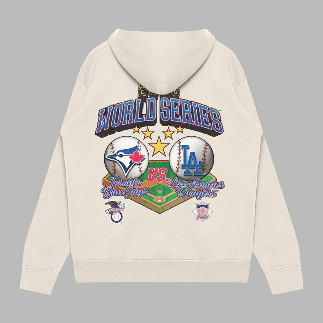 The hoodie features an exclusive front-and-back print celebrating the 2025 World Series matchup between Toronto and Los Angeles. The front showcases both team logos under a bold “World Series” header, while the back expands the design into a full diamond graphic, complete with baseball-themed details and championship flair. Every detail is crafted to honor the intensity of the series and the passion of the fans.