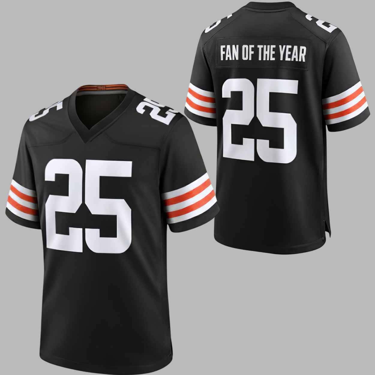 Show your loyalty in style with the Browns Fan Of The Year 2025 Jersey, a must-have for every die-hard Cleveland supporter. This sleek black jersey honors the passion, pride, and unwavering commitment of Browns fans who cheer rain or shine. With bold white numbers “25” on the front, back, and shoulders, and the proud inscription “Fan of the Year” across the back, this piece isn’t just apparel—it’s a badge of honor. The orange and white stripes on the sleeves add a vibrant pop of team spirit, making it the perfect jersey to wear on game day or any day you want to represent your Browns pride.