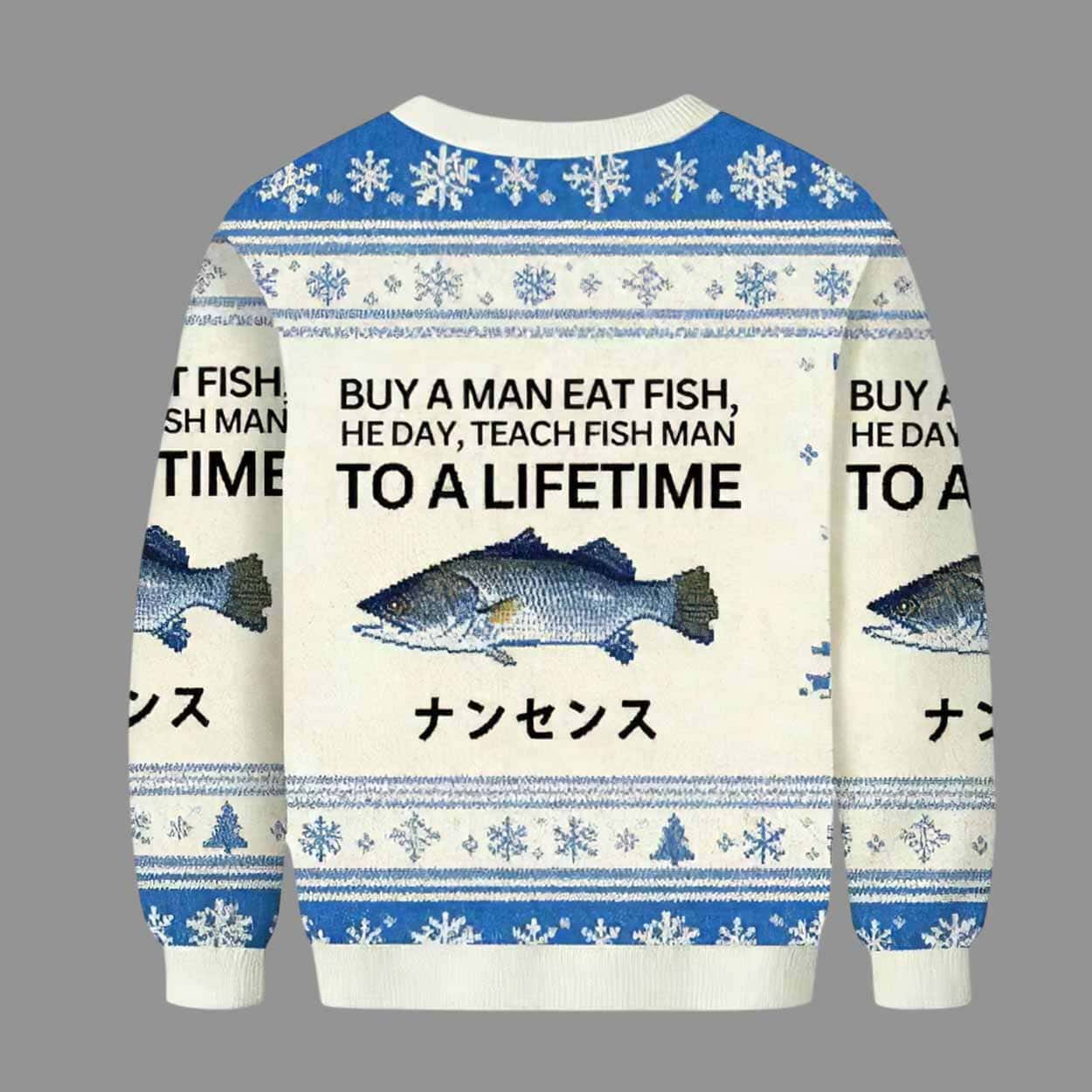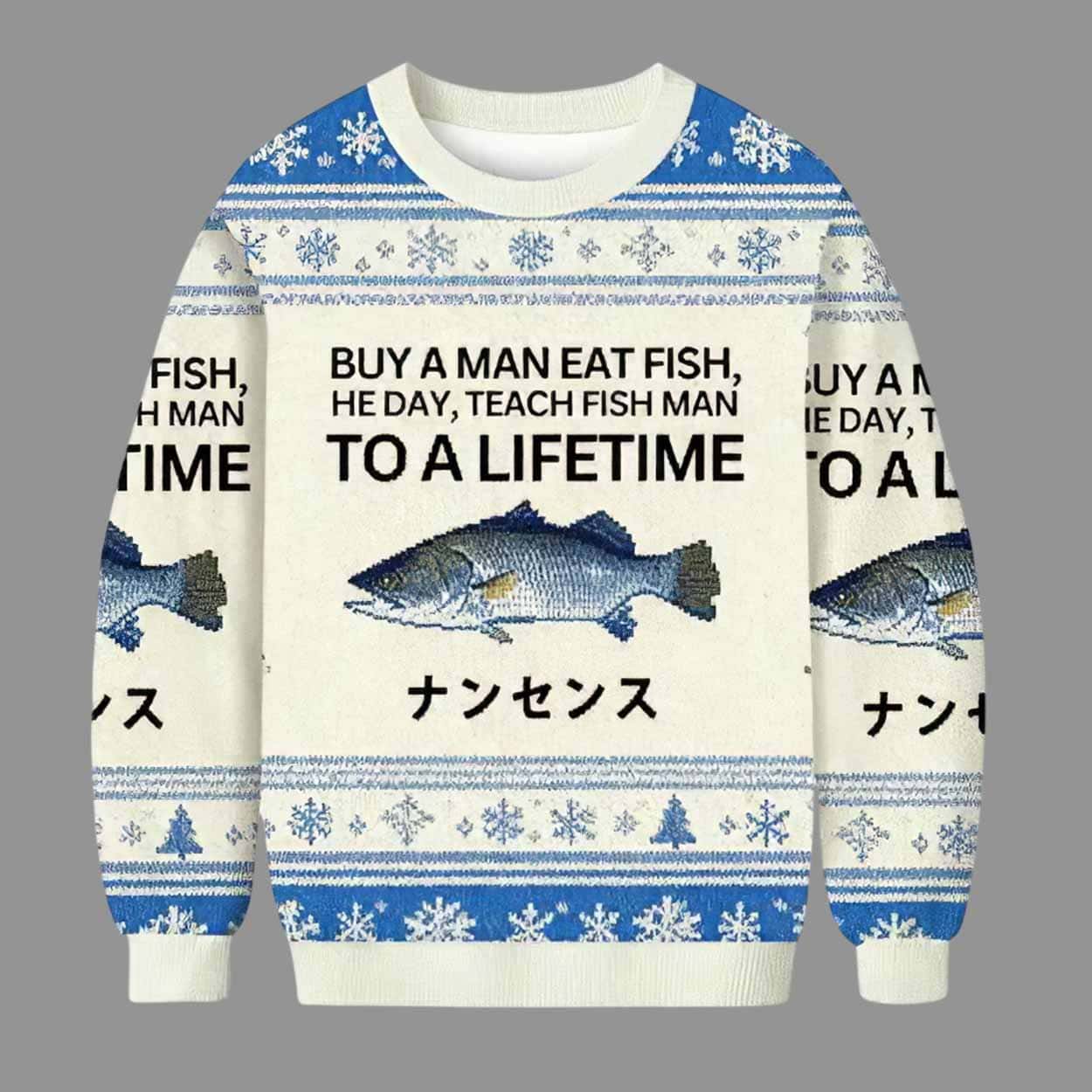 Elevate Your Style with Buy A Man Eat Fish He Day Teach Fish Man To A Lifetime Ugly Christmas Sweater