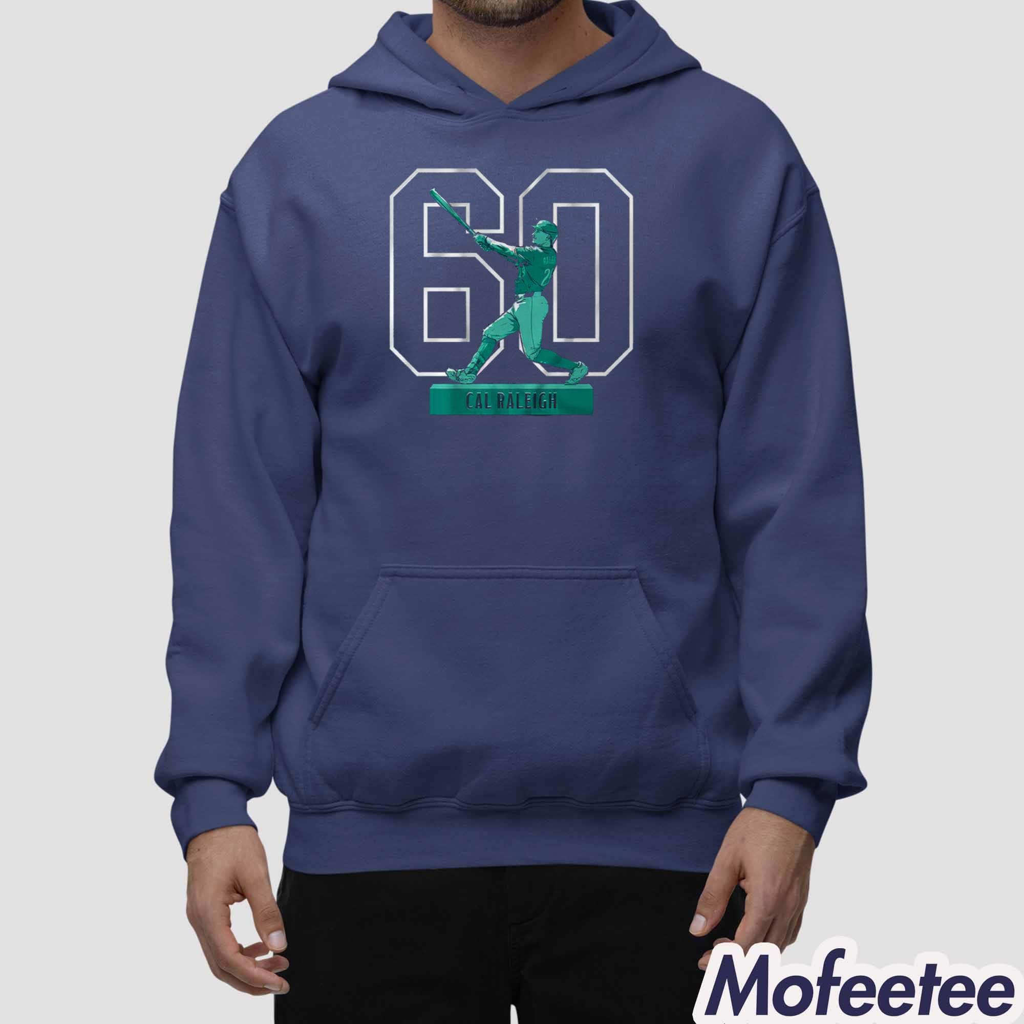 With its vibrant colors and bold design, this shirt features Raleigh’s iconic home run pose against a backdrop of his milestone number “60,” along with his name beneath it. The navy blue fabric provides a perfect contrast to the graphic, making the shirt visually appealing while maintaining the Mariners’ team colors.
