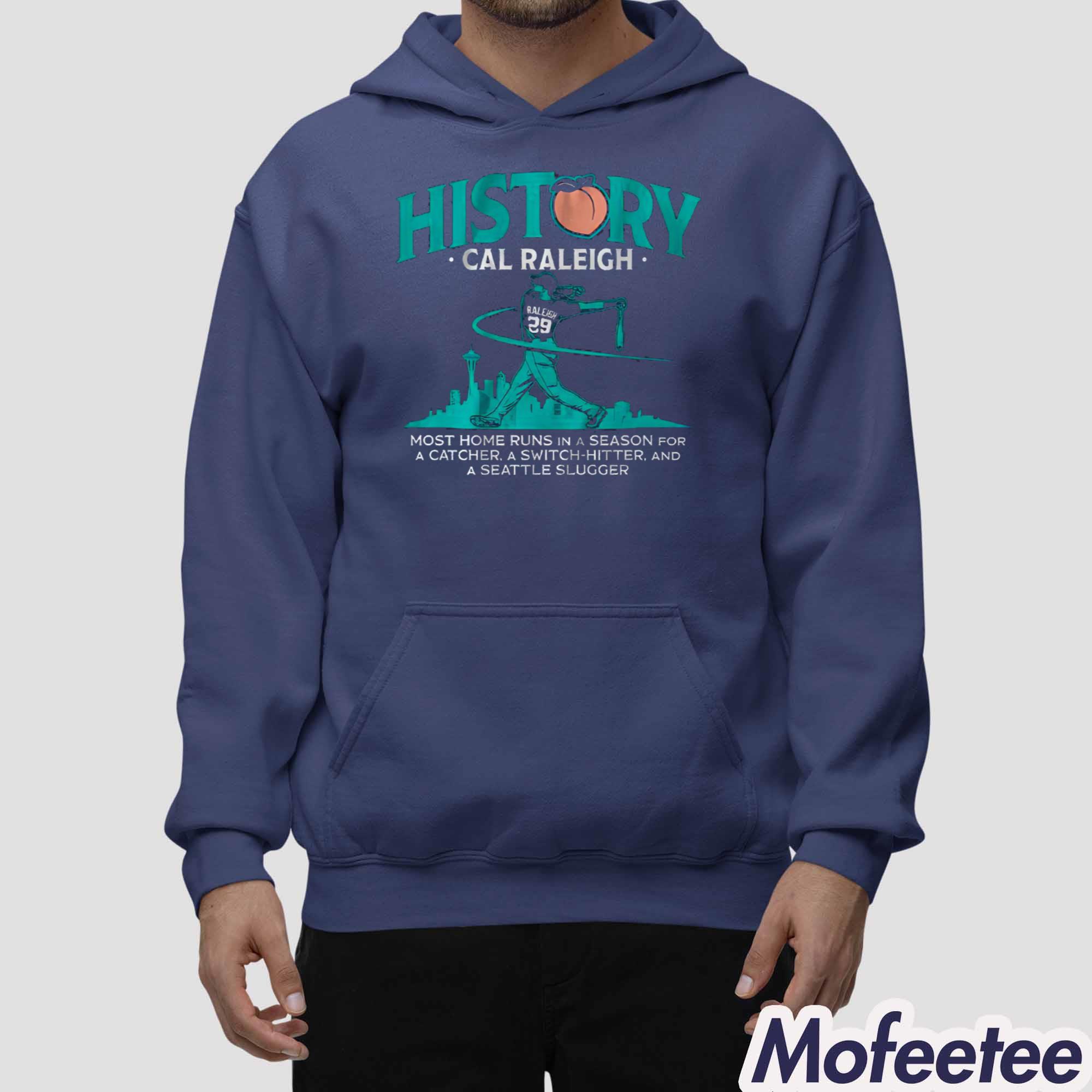 The shirt features an illustration of Raleigh in action, wielding his bat in front of the Seattle skyline, with the phrase “Most home runs in a season for a catcher, a switch-hitter, and a Seattle slugger” underlining his incredible feat. The word “HISTORY” at the top captures the essence of this legendary achievement, accompanied by a peach symbol to emphasize the achievement’s sweet success.