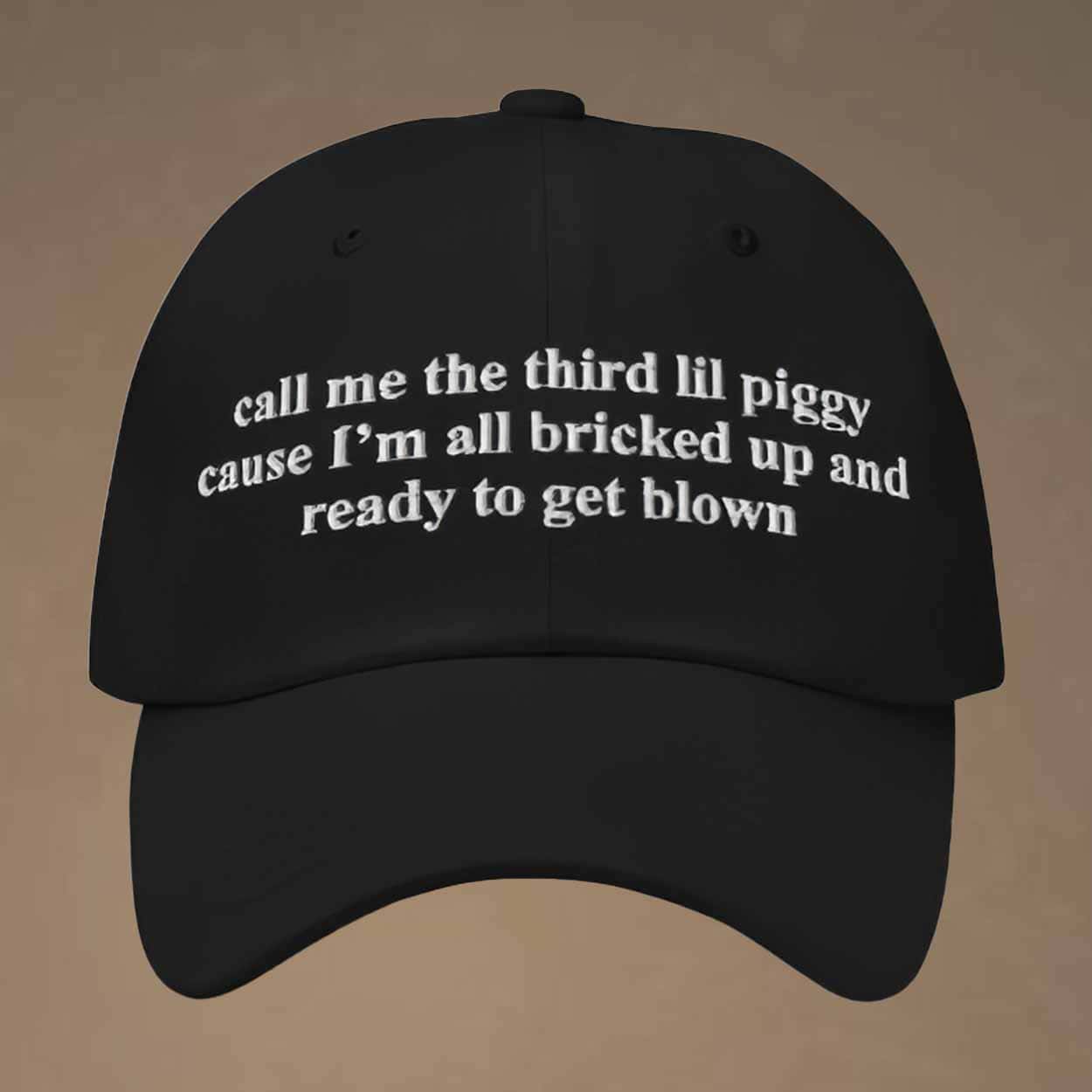 Made with high-quality, durable cotton, the hat is designed to provide comfort and long-lasting wear. The classic black cap features white text on the front that reads, “call me the third lil piggy cause I’m all bricked up and ready to get blown,” creating a playful and cheeky vibe. The text is stitched clearly and boldly, ensuring it stands out and grabs attention wherever you go.