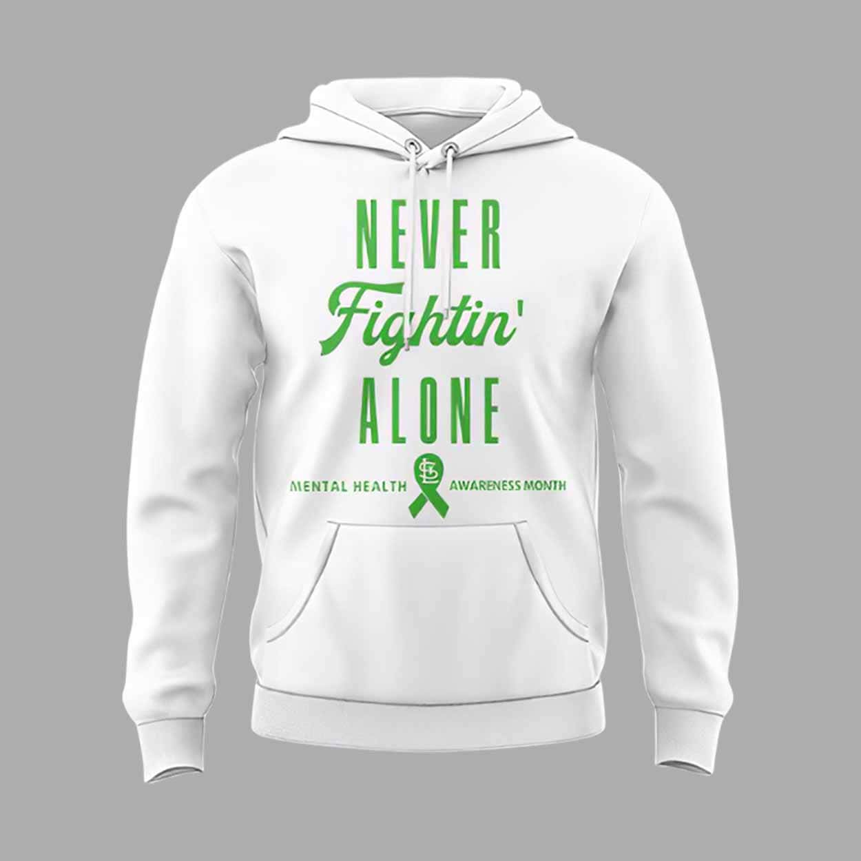 On the front, the hoodie reads “NEVER Fightin’ ALONE” in large, eye-catching text, with a green ribbon beneath it, representing support for those battling mental health challenges. The back of the hoodie features the iconic St. Louis Cardinals logo and the word “Cardinals” in green, making it a perfect piece for any fan.