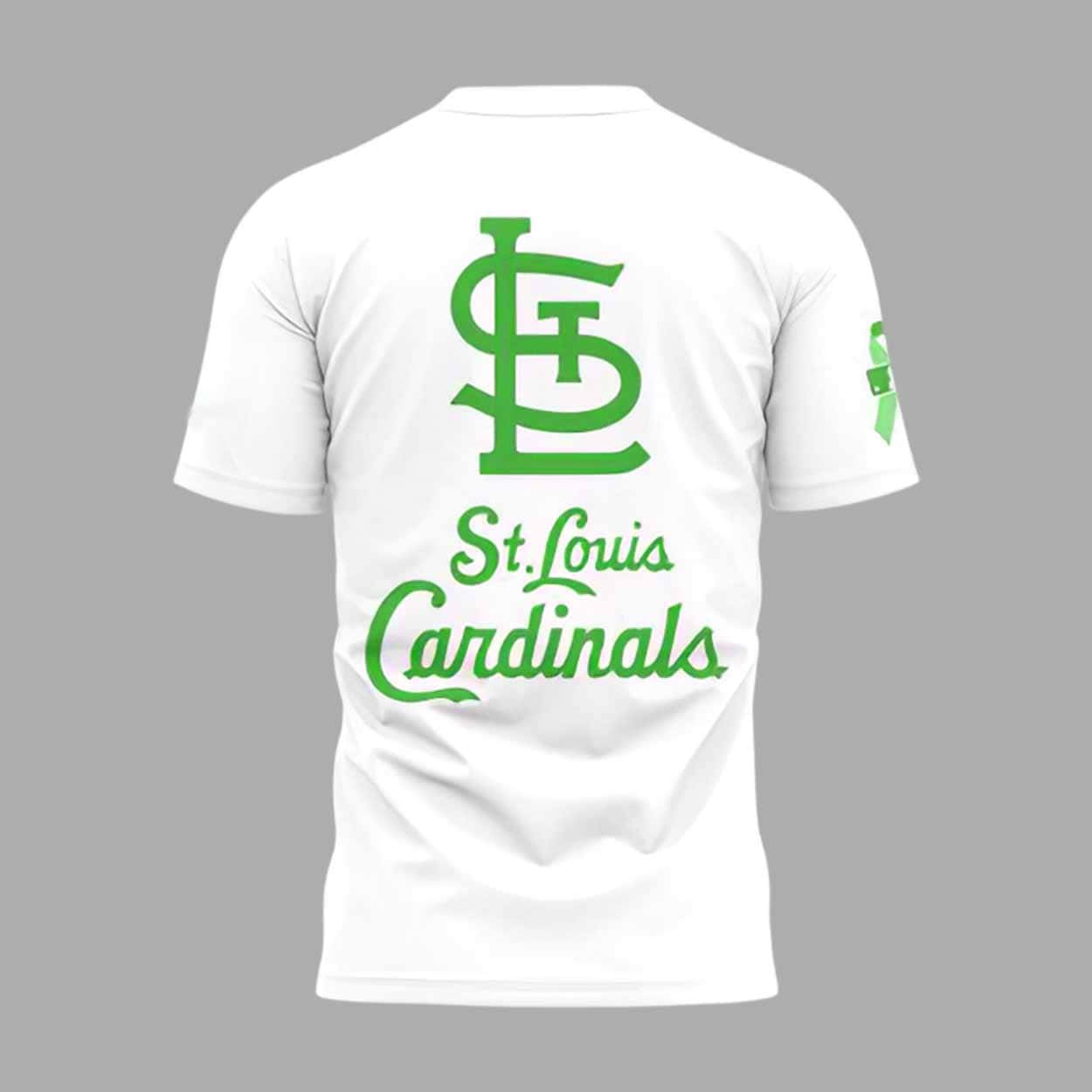 The bold design includes a prominent message, “Never Fightin’ Alone,” along with the green ribbon for mental health awareness. The shirt features the iconic St. Louis Cardinals logo, making it a great addition to any fan’s wardrobe.
