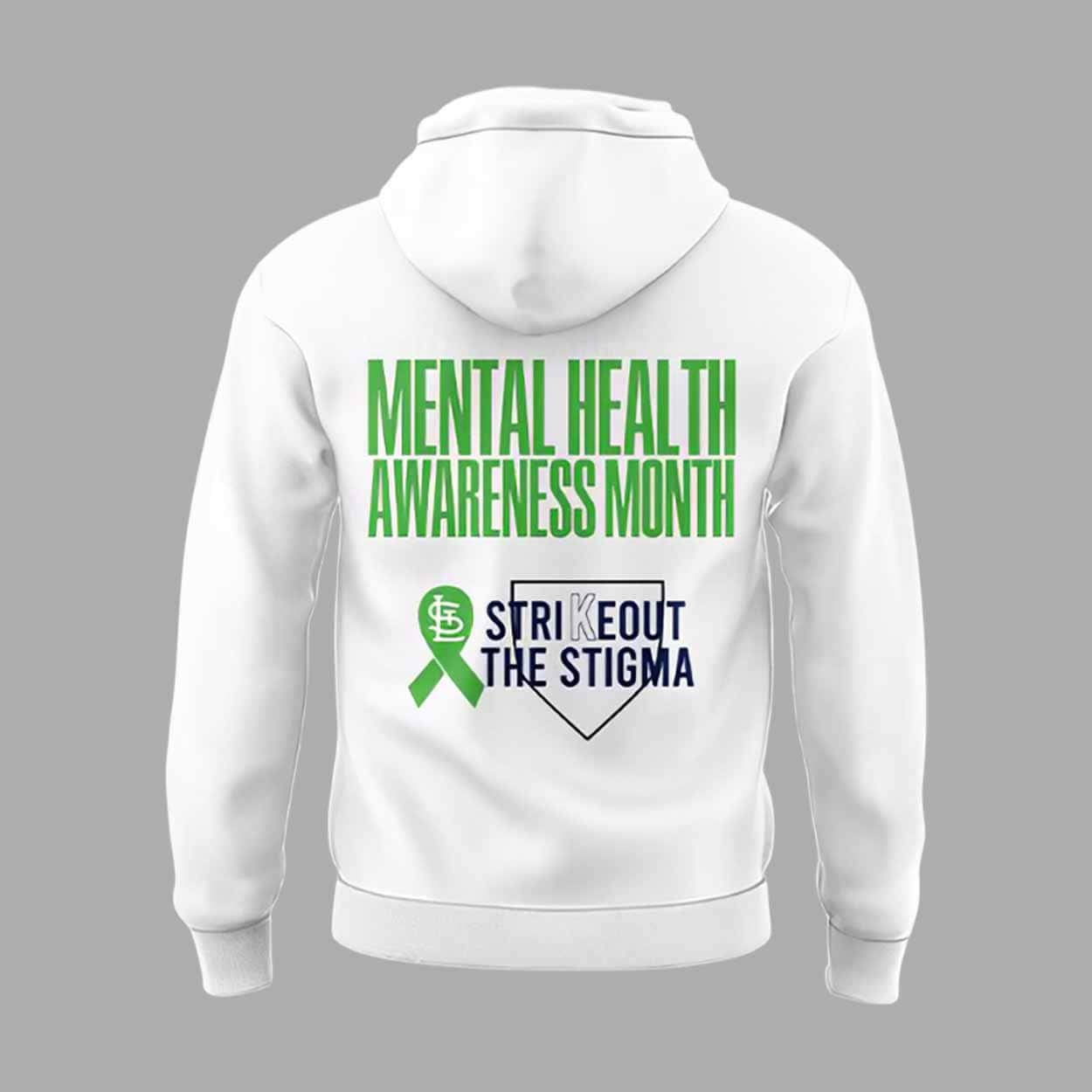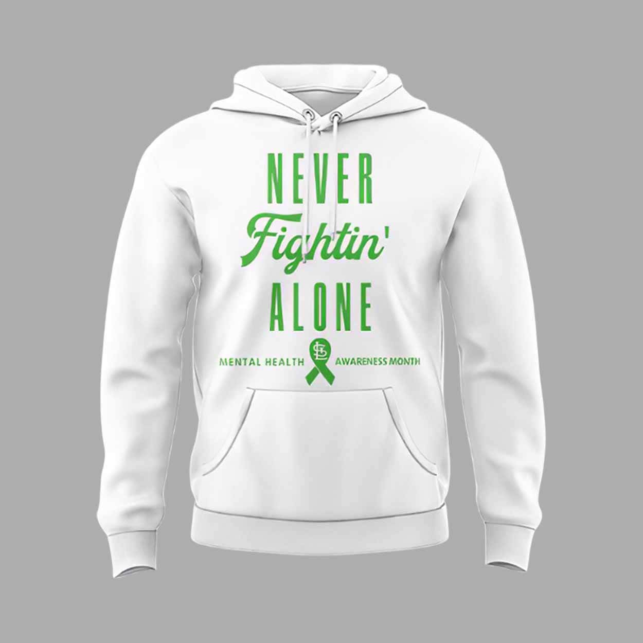 The in a classic white hoodie style, this piece features bold green and blue graphics that symbolize mental health awareness and the St. Louis Cardinals. The front of the hoodie showcases the phrase “NEVER Fightin’ ALONE” with the green ribbon for mental health awareness, while the back includes “Mental Health Awareness Month” and the powerful phrase “STRIKE OUT THE STIGMA,” making this hoodie not only comfortable but also meaningful.