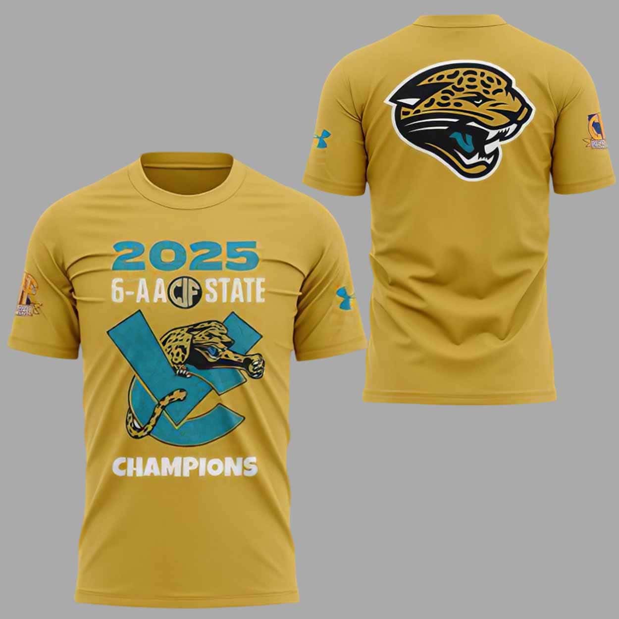 This hoodie features a striking gold base that instantly stands out, symbolizing both excellence and school spirit. The front showcases a powerful graphic combining the 2025 championship year, “6-AA CIF State,” and a dynamic jaguar leaping through an oversized “C” logo. The artwork uses vivid blue and white detailing to highlight team identity and celebrate the victory in a clean, energetic way. On the back, a large jaguar head emblem takes center stage, bringing a bold, athletic finish to the design.