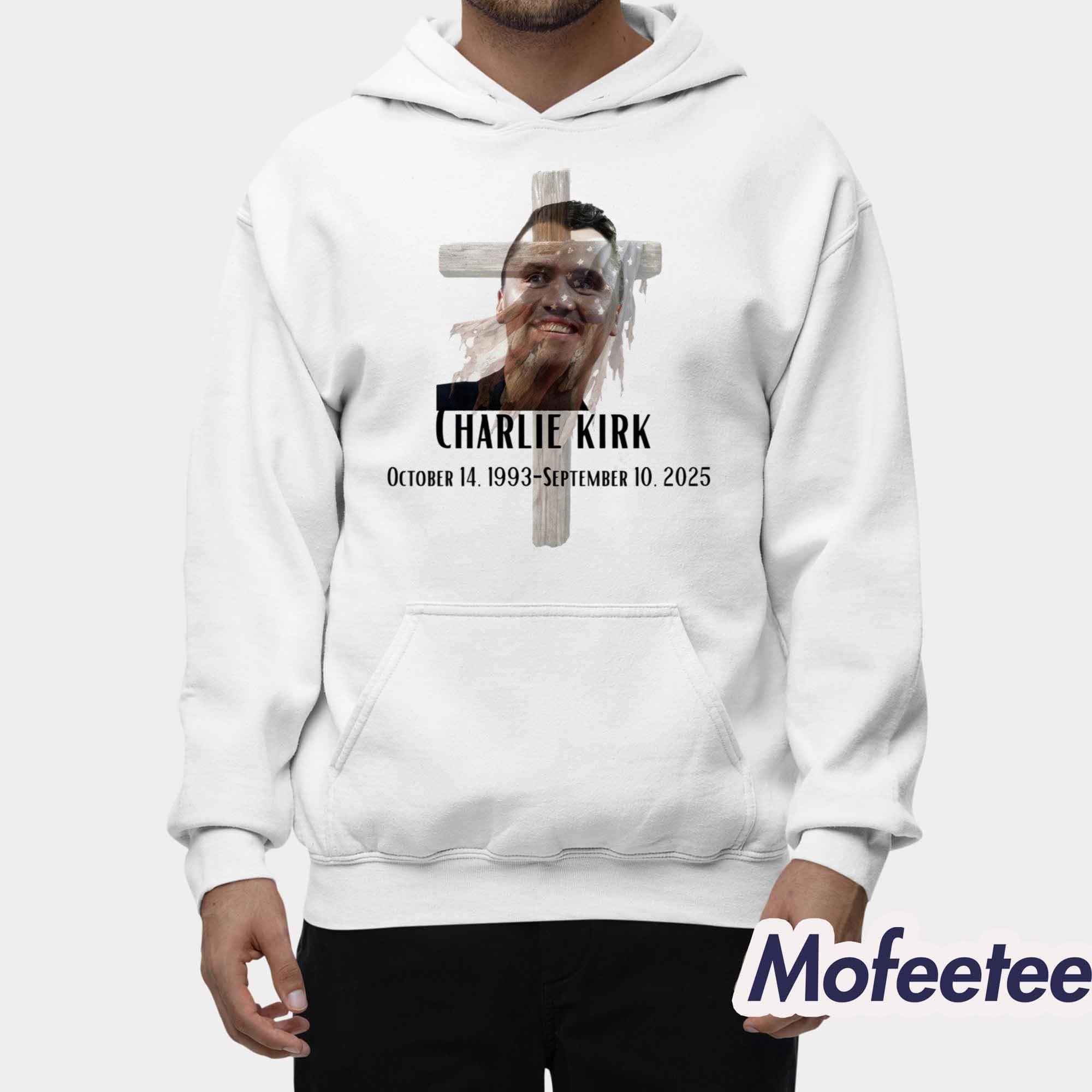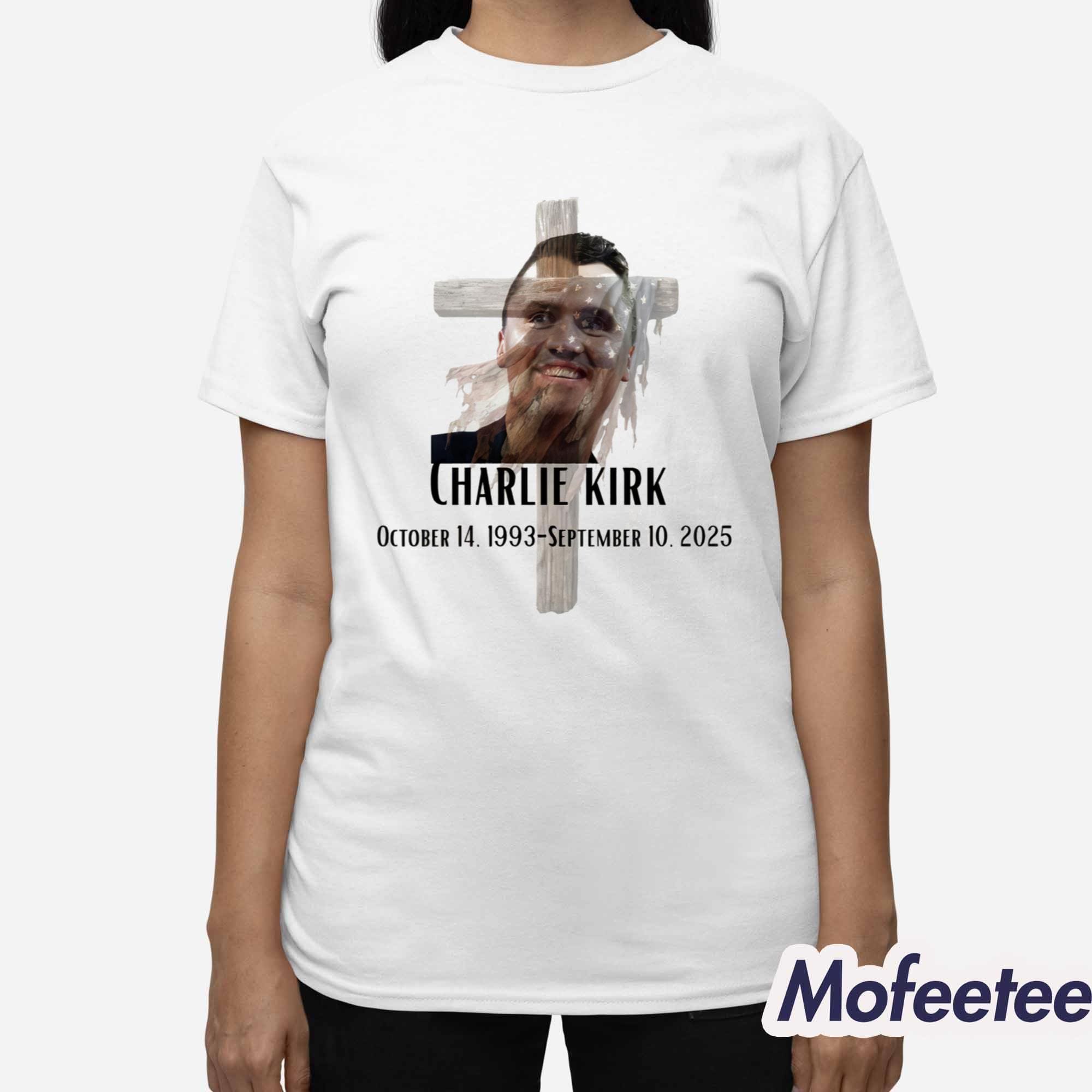 The shirt features a powerful and striking design that honors Charlie Kirk’s legacy. The front of the shirt showcases a beautiful image of Charlie, artistically blended with a cross, symbolizing his impact and influence. The text beneath the image reads “Charlie Kirk,” along with the significant dates “October 14, 1993 – September 10, 2025,” marking the key moments of his life and work.