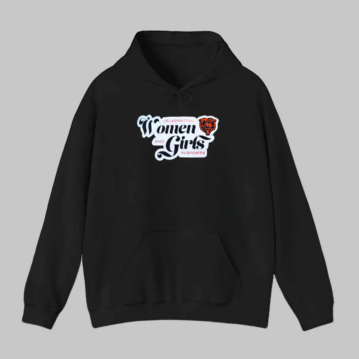 The shirt features a sleek black background with a vibrant front graphic. The design includes the text “Celebrating Women and Girls in Sports” in a stylish, mixed-font layout. The words “Women” and “Girls” are bold and flowing in white with a subtle blue outline, while “Celebrating” and “And” are in an uplifting pink tone. Adding to the authenticity is the official Chicago Bears logo, proudly displayed alongside the text, giving the shirt a genuine team-licensed look.