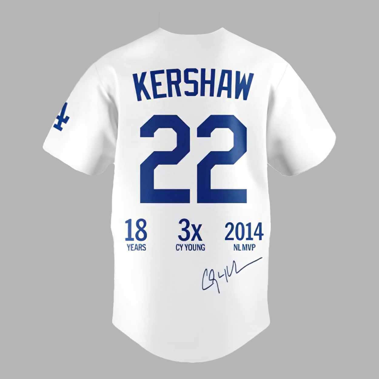 The jersey is designed with fans in mind, combining functionality and nostalgia. This white jersey features the classic Dodgers logo across the chest with the number 22, representing Kershaw’s legendary career with the team. The back showcases Kershaw’s name and number, with additional details celebrating his remarkable achievements: “18 Years,” “3x CY YOUNG,” and “2014 NL MVP,” alongside his signature for an added personal touch.