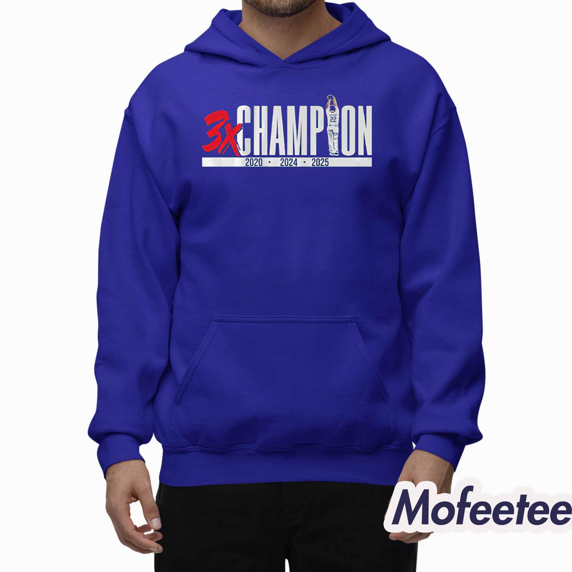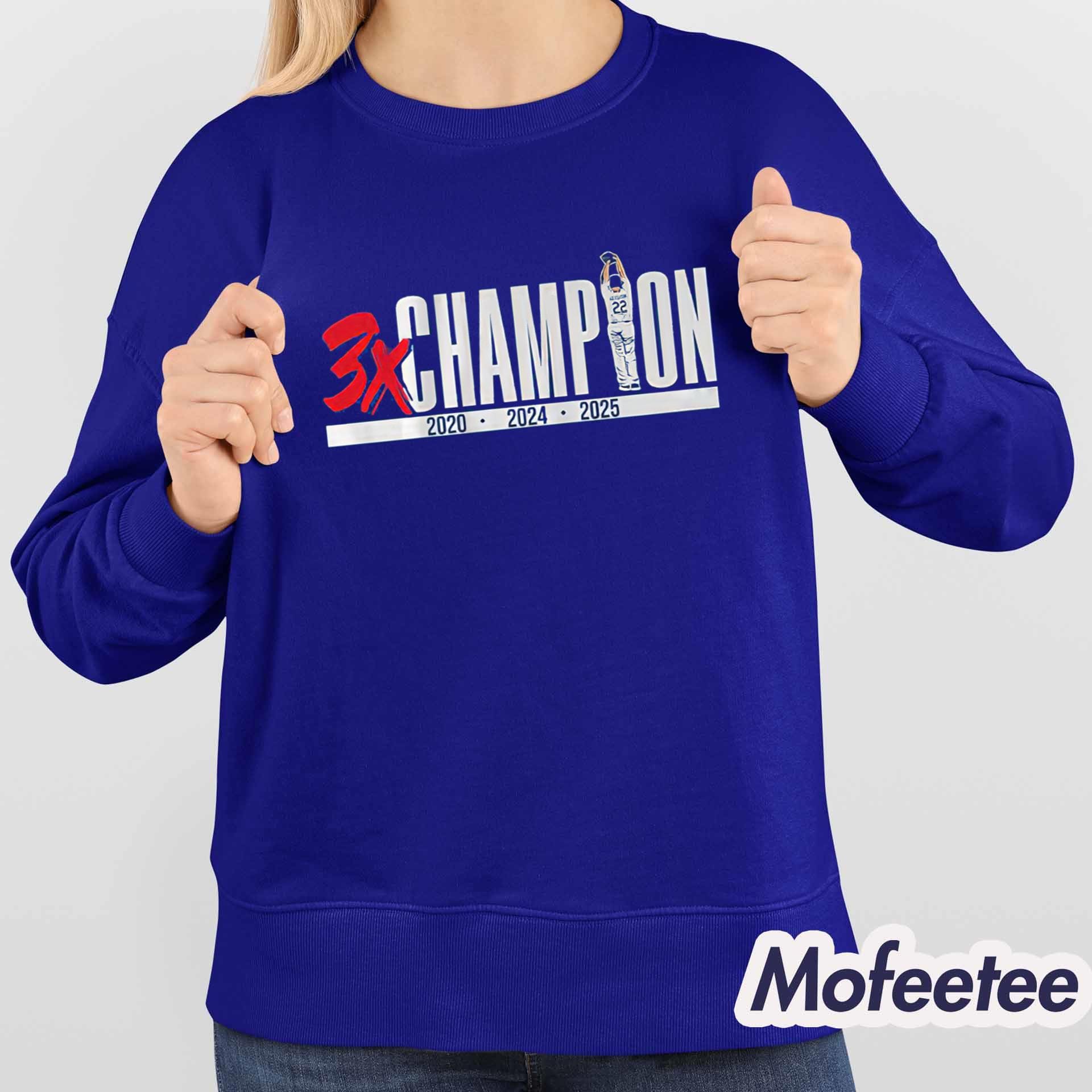 The shirt features a bold and sleek design in vibrant Dodger blue. The front of the shirt proudly displays “3X CHAMPION” in striking typography, with the number “3X” highlighted in red to symbolize strength, victory, and dominance. Within the word “CHAMPION,” the letter “I” is creatively replaced with an illustration of Kershaw mid-celebration—an iconic image that captures his passion and determination. Below, the years 2020, 2024, and 2025 are neatly lined up, representing his unforgettable championship milestones.