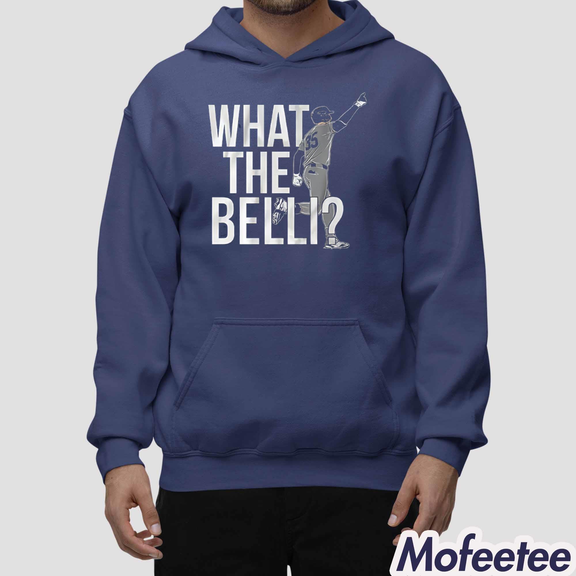 The shirt features an iconic silhouette of Bellinger mid-celebration, complete with his signature number 35 and unmistakable swag. The bold phrase “WHAT THE BELLI?” is printed in large block letters, perfectly capturing the surprise and excitement Belli brings to the game. It’s fun, clever, and sure to make fellow fans nod with approval.