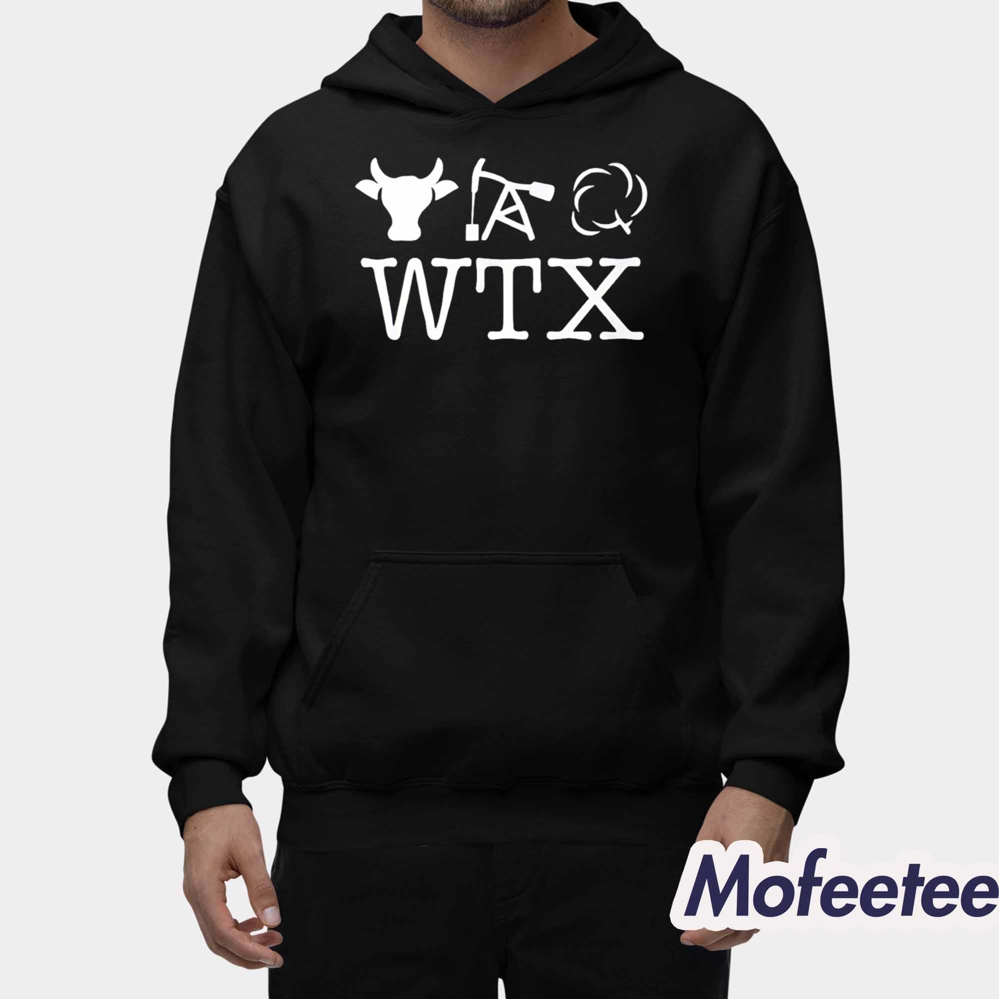The front of the shirt features a simple but powerful lineup of symbols: a cattle head, an oil pump jack, a cotton boll, and the bold letters “WTX.” Each icon represents a major pillar of West Texas life—ranching, oil, and agriculture—coming together to form a design that feels authentic and full of regional pride. The high-contrast white graphic printed on a black tee ensures the design stands out clearly while adding a modern, polished touch.