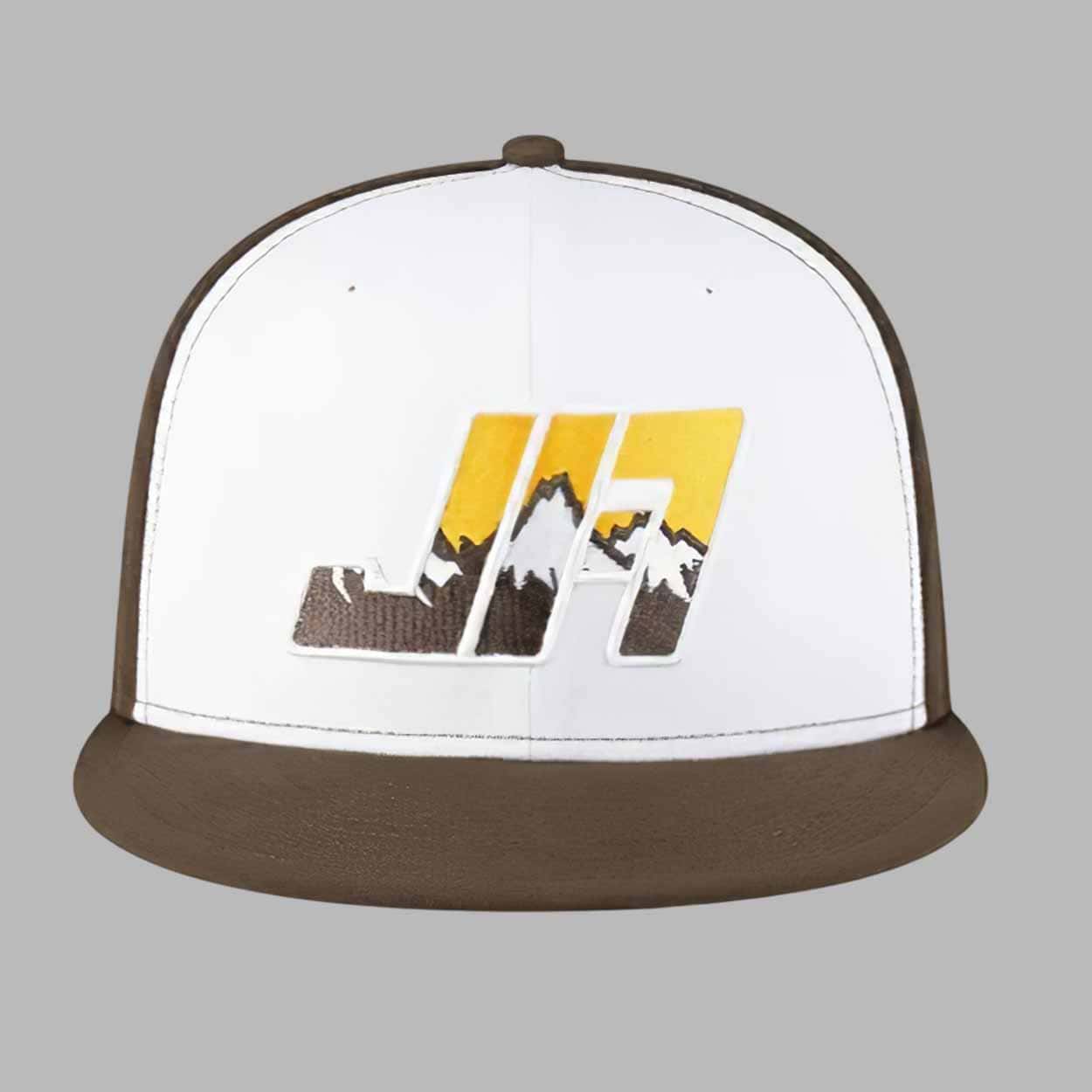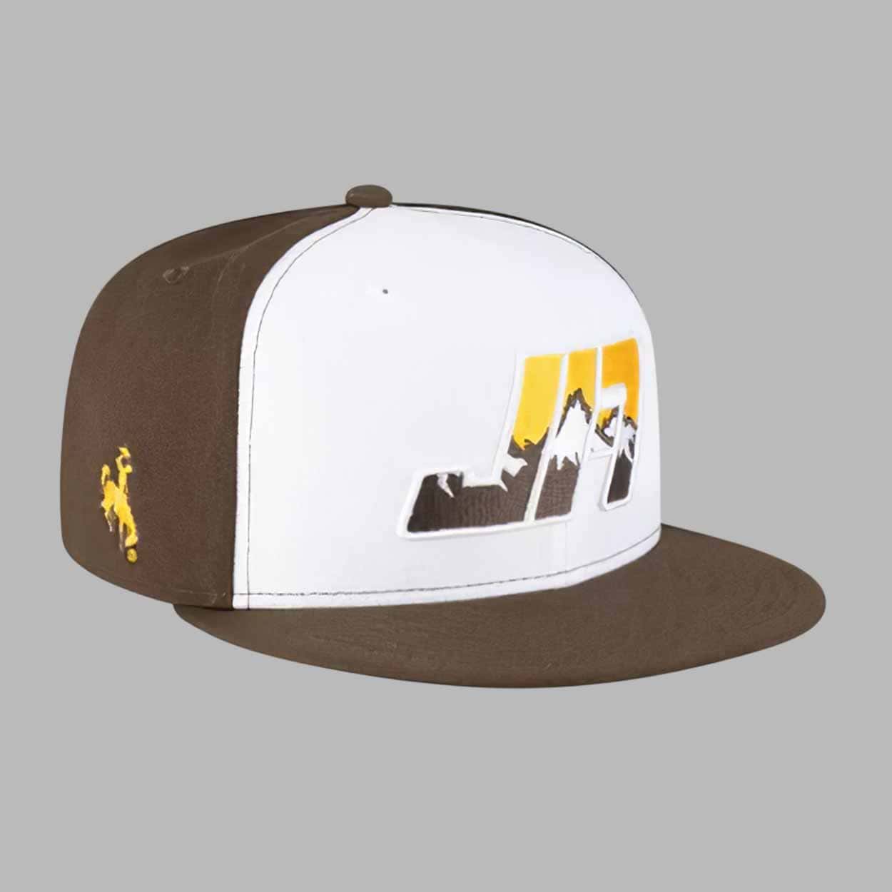 This cap features a crisp two-tone design with a white structured front panel and rich brown sides and brim. The front showcases a bold embroidered “JA” logo filled with a mountain-range pattern, symbolizing Allen’s Wyoming roots and strong spirit. The signature yellow-and-black cowboy emblem is stitched onto the side, adding an authentic touch that brings the entire design together. The embroidery is precise, durable, and crafted to maintain sharp detail over time.