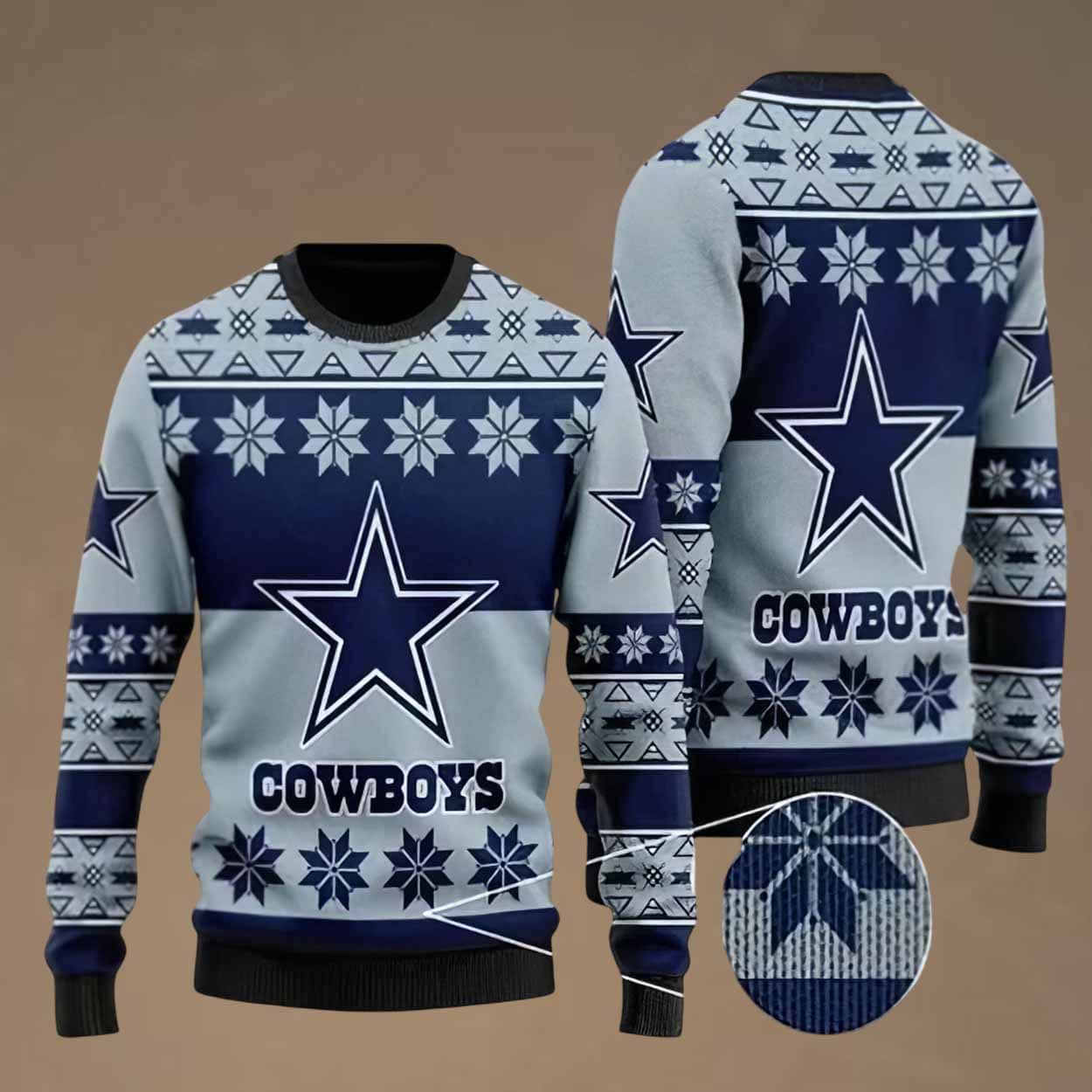 The large Cowboys star takes center stage on the front, framed by an intricate, snowflake-inspired pattern that adds a festive touch. The word “COWBOYS” is prominently displayed at the bottom, completing the bold design. The sweater features a classic crewneck and ribbed cuffs and hem, ensuring a comfortable, snug fit that retains warmth.