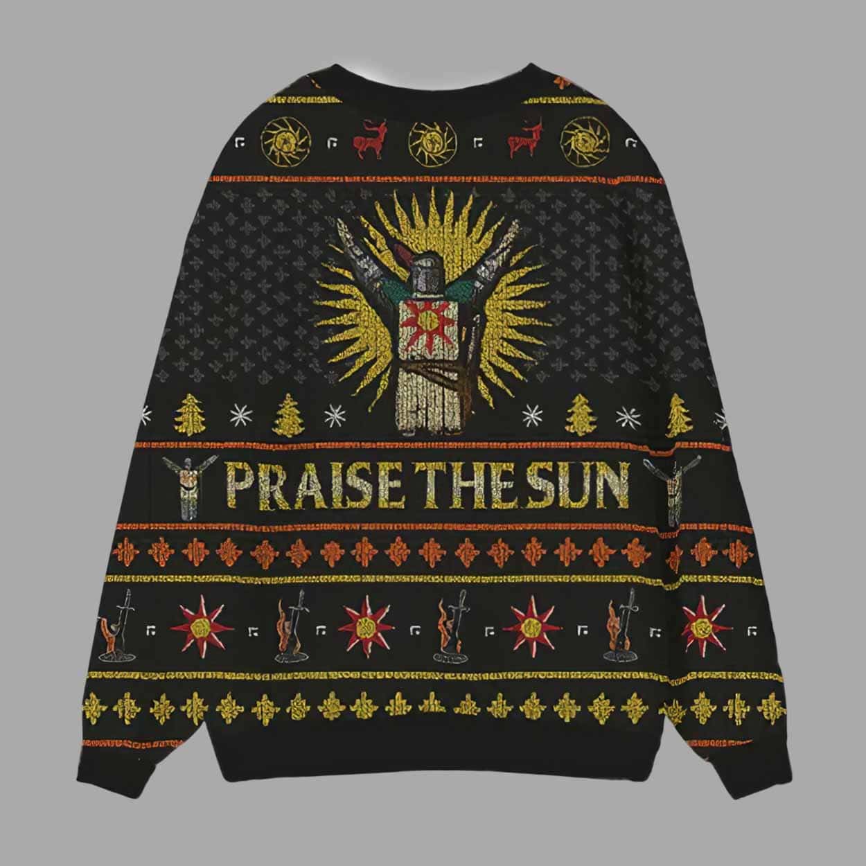 This cardigan captures the essence of Dark Souls through stunning all-over artwork featuring Solaire, radiant sun motifs, runic symbols, and patterns inspired by medieval iconography. The rich black background contrasts beautifully with the gold, orange, and red accents, creating a visually striking design that feels both festive and faithful to the game’s aesthetic. The repeating “Praise the Sun” banner across the front and back completes the look, instantly recognizable to fellow fans.