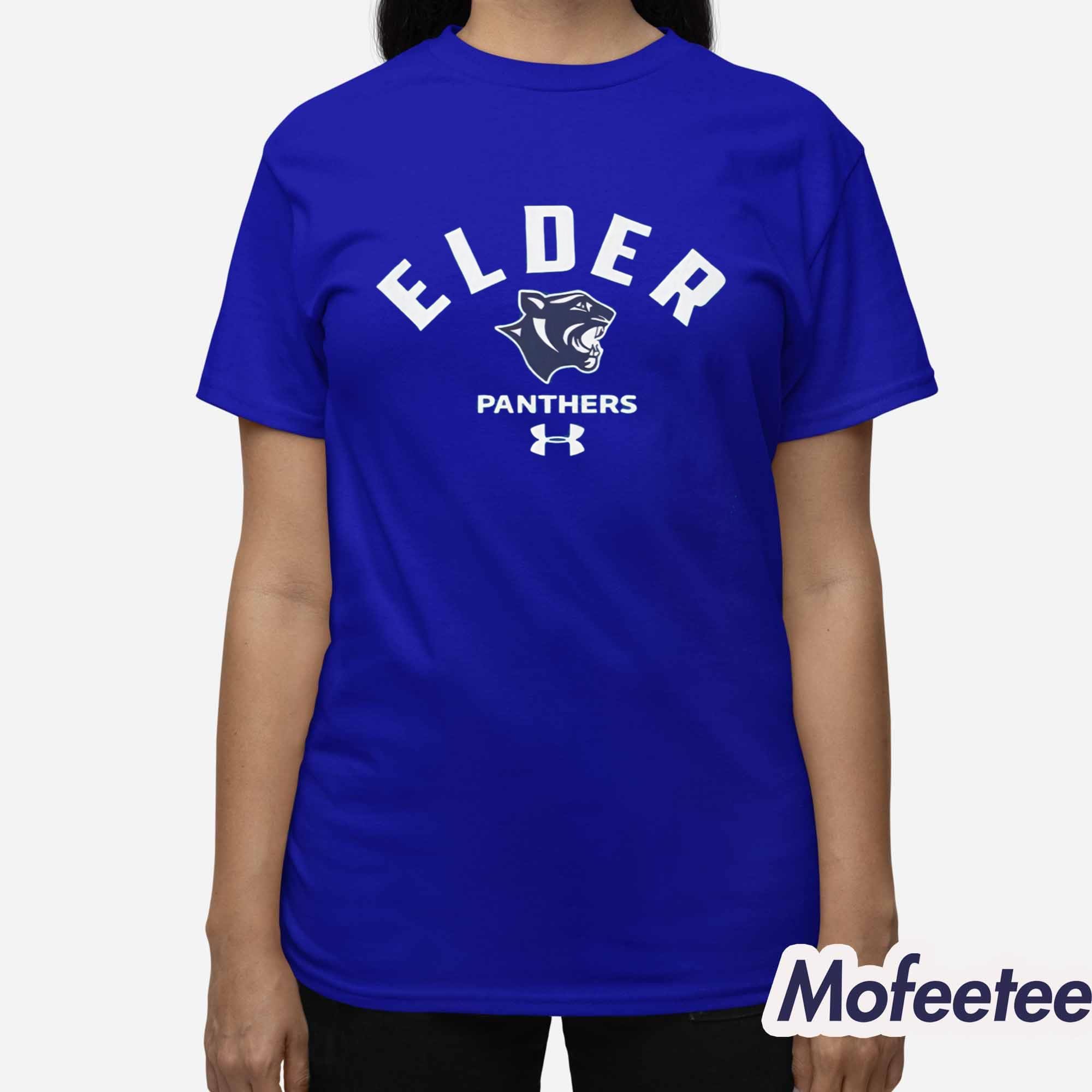 This hoodie features a striking royal-blue base paired with crisp white lettering that spells out “ELDER” in a bold arch. At the center sits the fierce Elder Panthers mascot—adding character, strength, and team spirit to the design. Below it, the subtle athletic icon reinforces the sporty aesthetic, giving the hoodie a premium and competitive look.