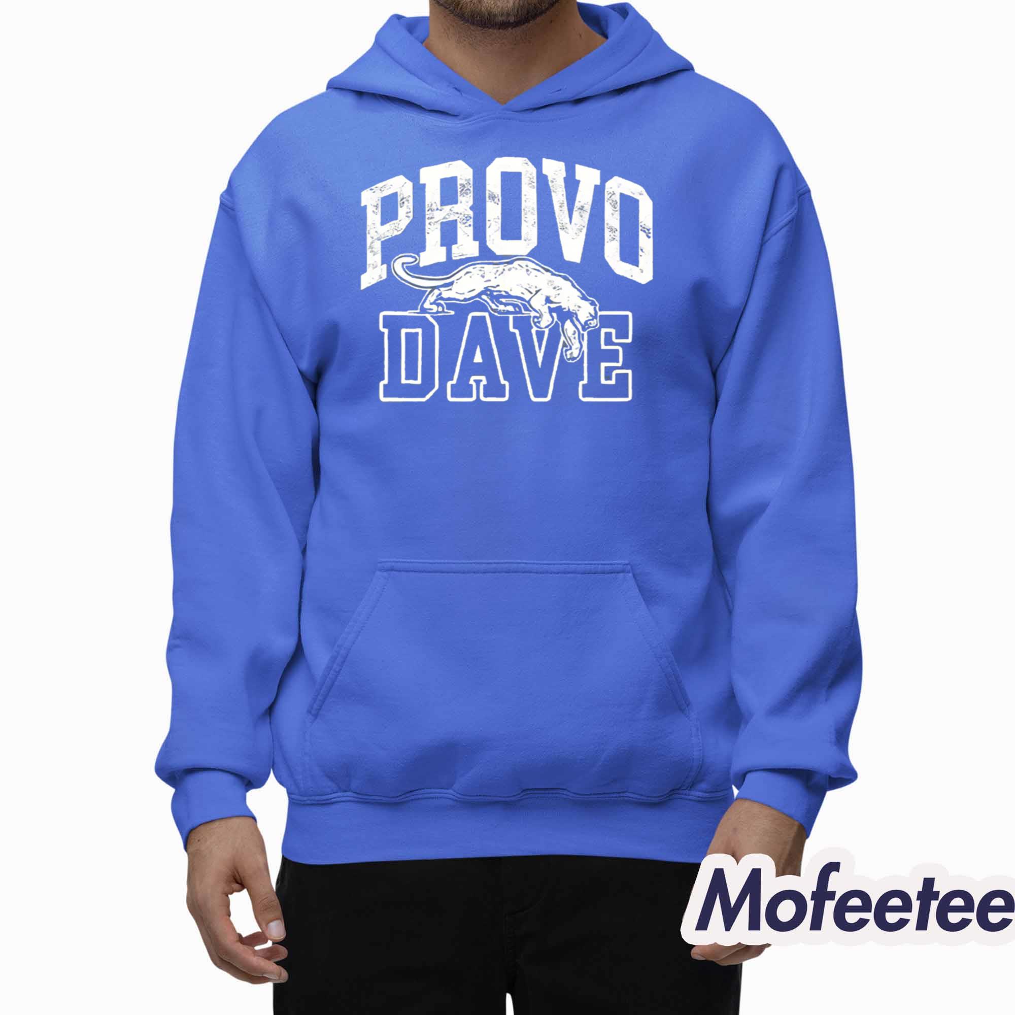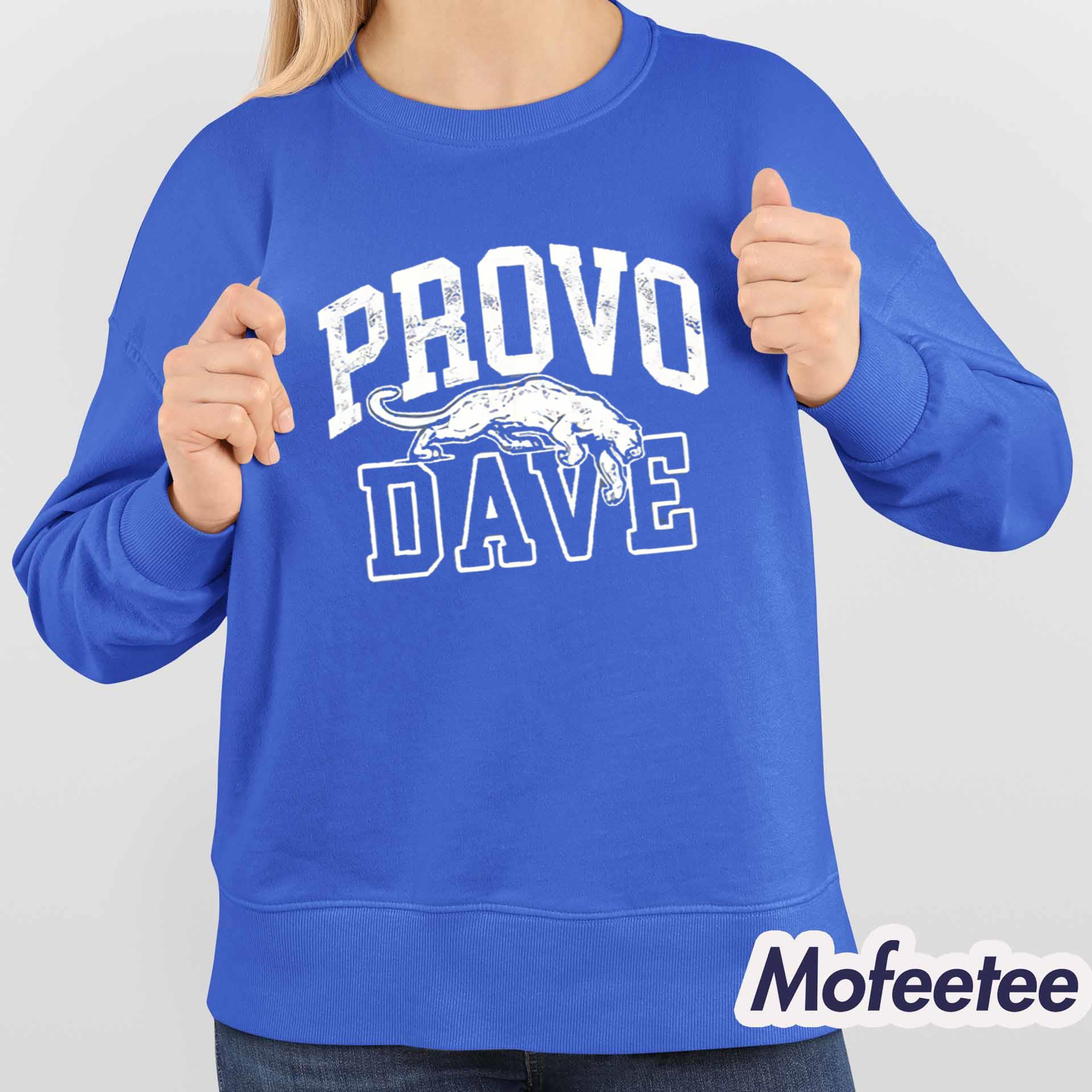 The shirt features a powerful blue-and-white color scheme with bold collegiate lettering that spells “PROVO” across the chest. Beneath it, the name “DAVE” anchors the design with confident block typography. Centered between the two is a leaping cougar graphic—symbolic, energetic, and instantly recognizable. The distressed effect adds a vintage, game-day feel, making the shirt feel both timeless and modern.