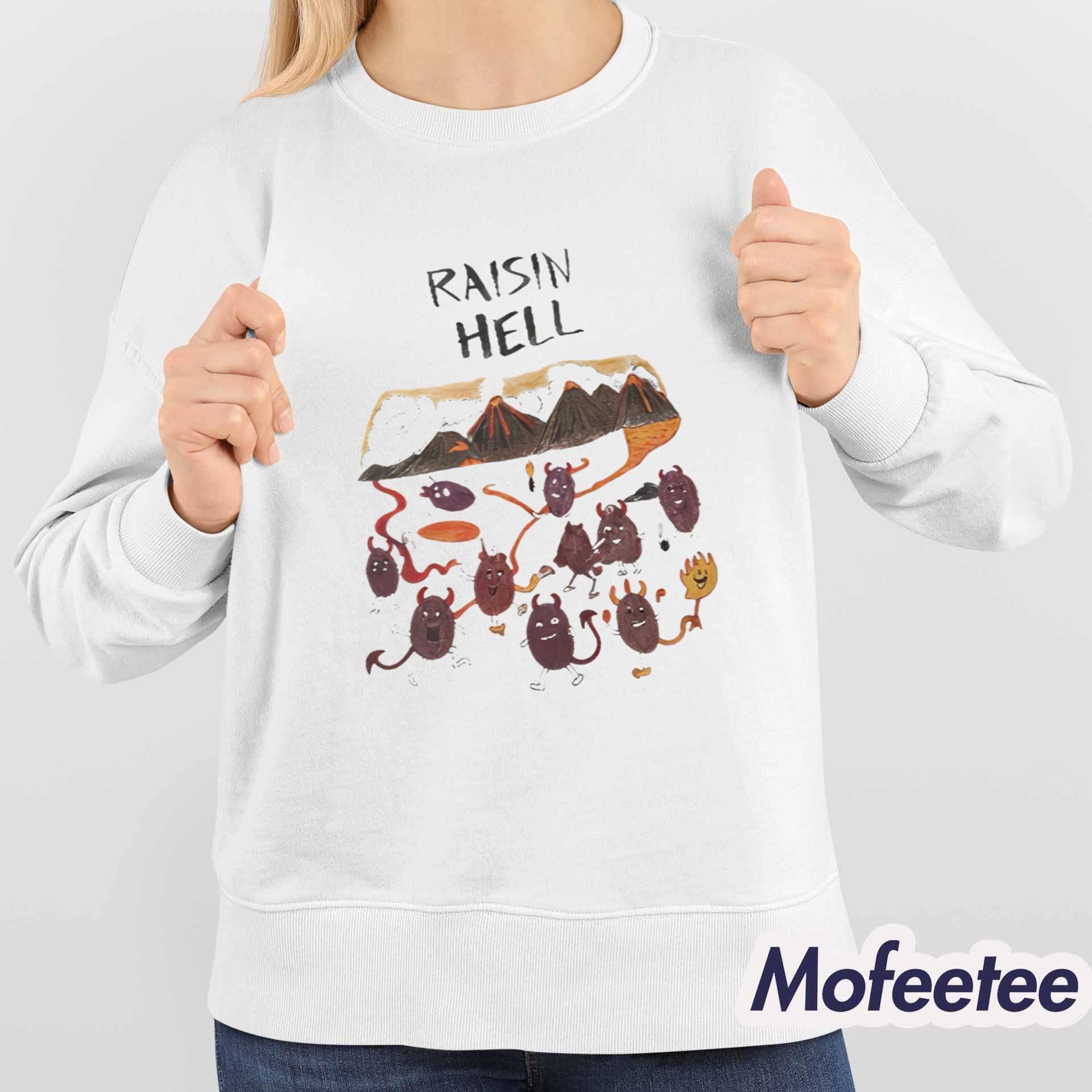 The shirt features a vibrant, cartoon-inspired graphic with a group of mischievous raisins causing chaos in a volcanic scene. With its playful colors and exaggerated design, it perfectly captures the humor and creativity behind the phrase “Raisin Hell.” The graphic is printed on a high-quality white cotton tee that is soft, breathable, and comfortable for everyday wear.