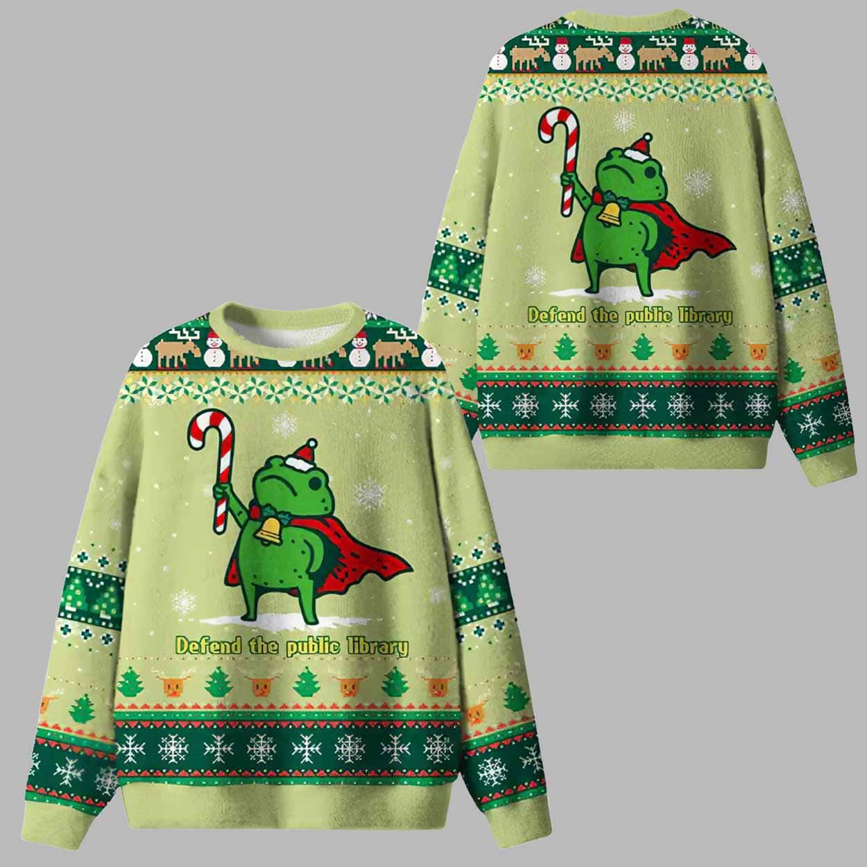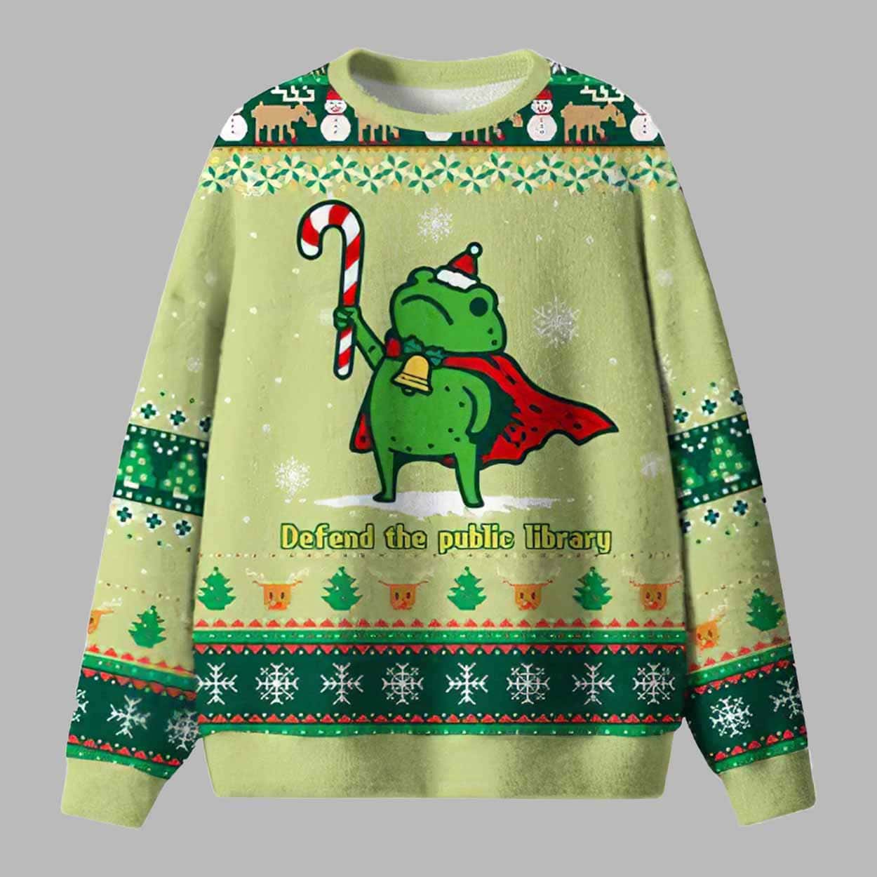 A Whimsical Winter Statement with a Purpose Defend The Public Library Frog Ugly Christmas Sweater