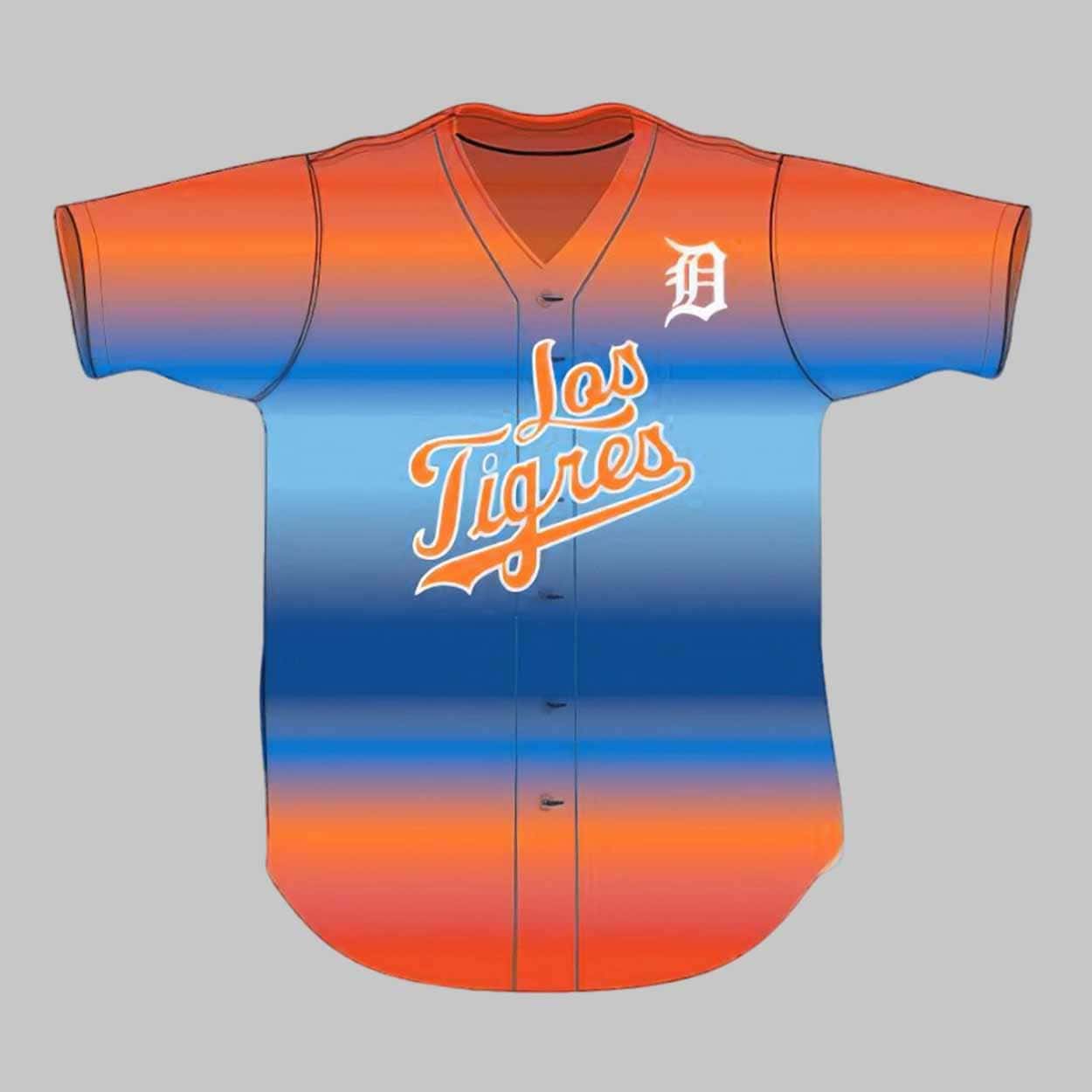 The jersey 2025 features a stunning horizontal gradient design that blends fiery oranges and cool blues—colors inspired by classic Latin American textiles and festive spirit. The front proudly displays the stylized script “Los Tigres” across the chest, while a crisp white “D” logo anchors the upper chest, connecting the cultural celebration to Detroit baseball legacy.