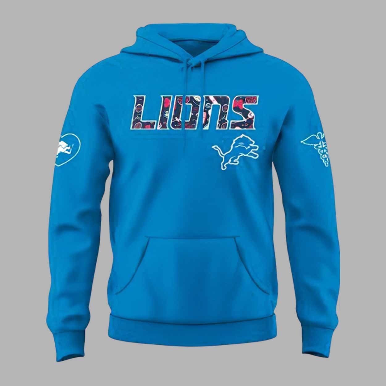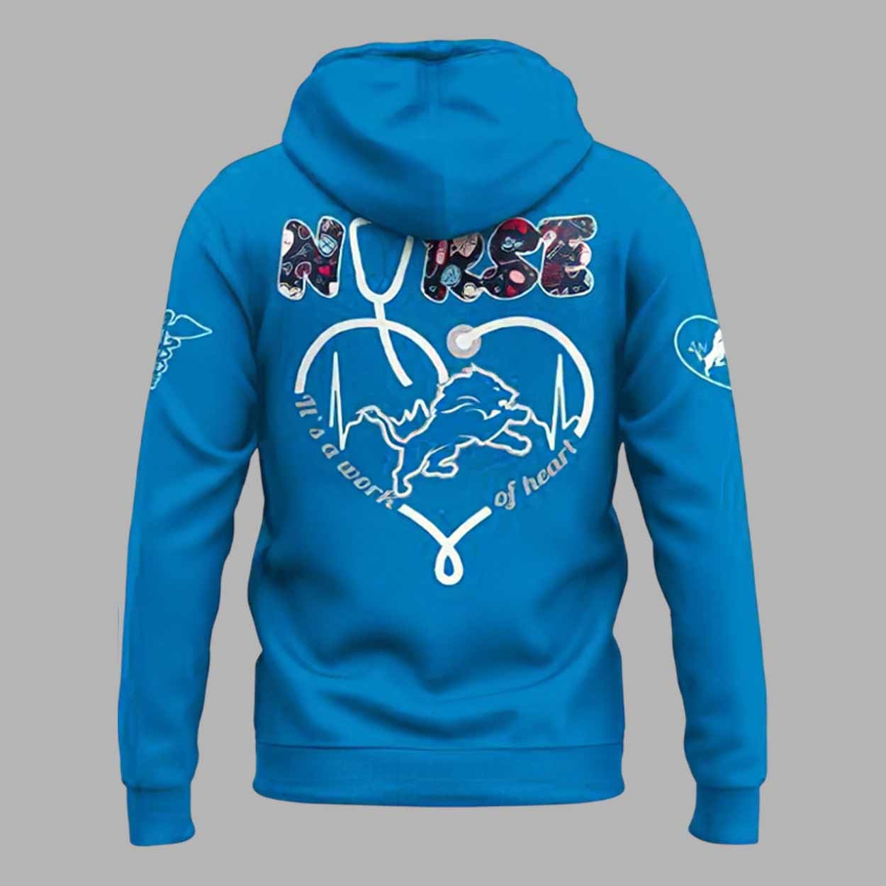 The vibrant blue color highlights the unique design elements on both the front and back. On the front, the word “LIONS” is boldly displayed with a pattern inspired by healthcare, and on the sleeves, the Lions logo and a nurse’s stethoscope heart symbolize the connection between the sports world and the healthcare heroes who support us. The back of the hoodie also features the “NURSE” text integrated into a heart-shaped design, symbolizing the compassion and strength of the nursing community.