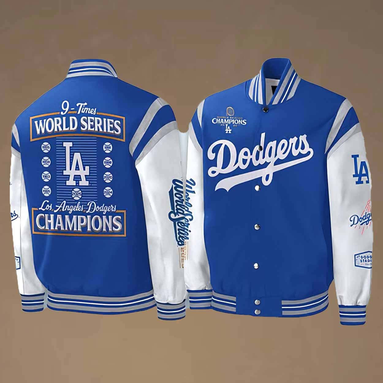 Celebrate nearly a century of baseball excellence with the Dodgers 9-Times World Series Champions 2025 Baseball Jacket. A true collector’s piece, this jacket paystribute to the Los Angeles Dodgers’ historic championship run — a franchise built on resilience, teamwork, and unmatched talent. Designed for true fans, it combines classic varsity style with premium comfort, allowing you to wear your pride wherever you go.