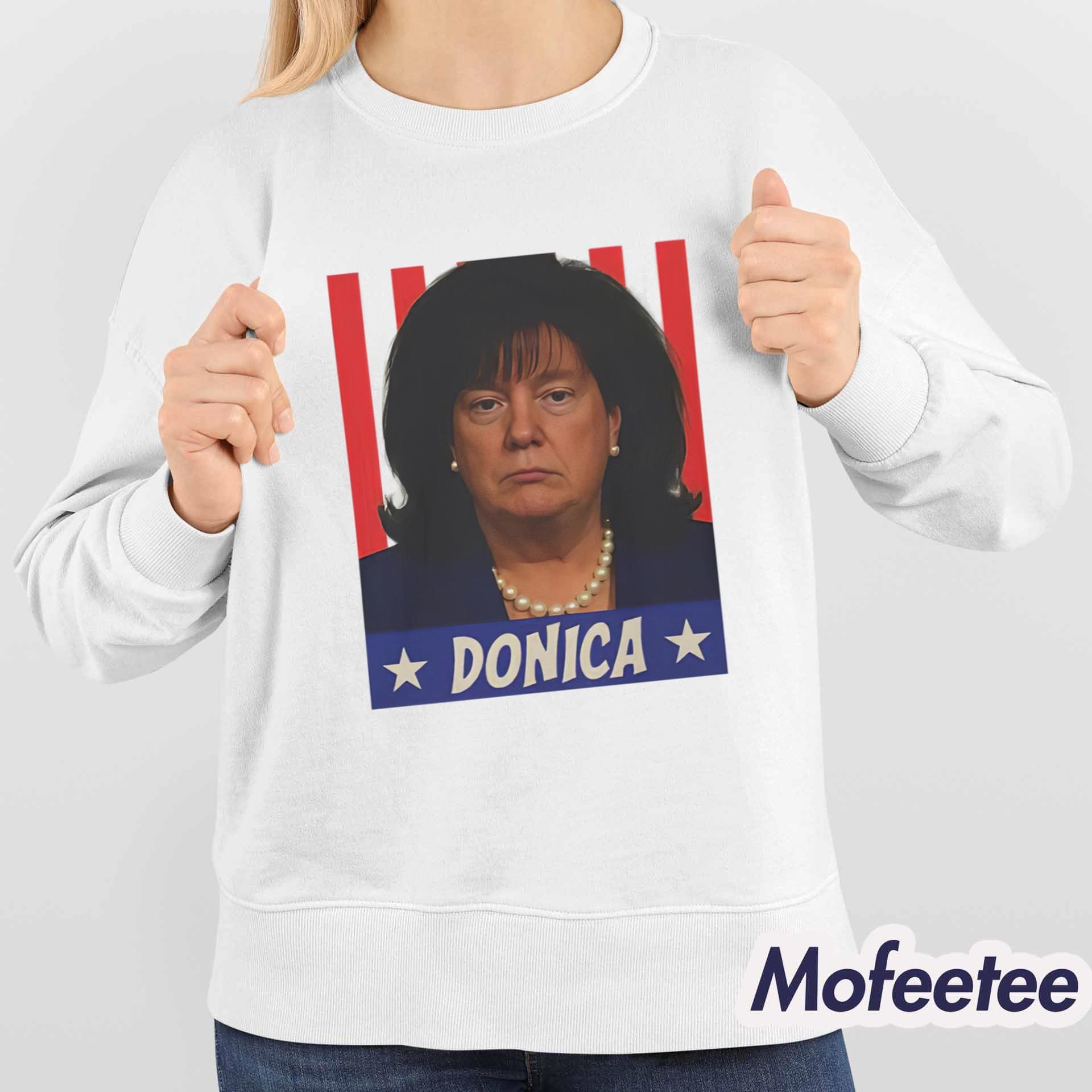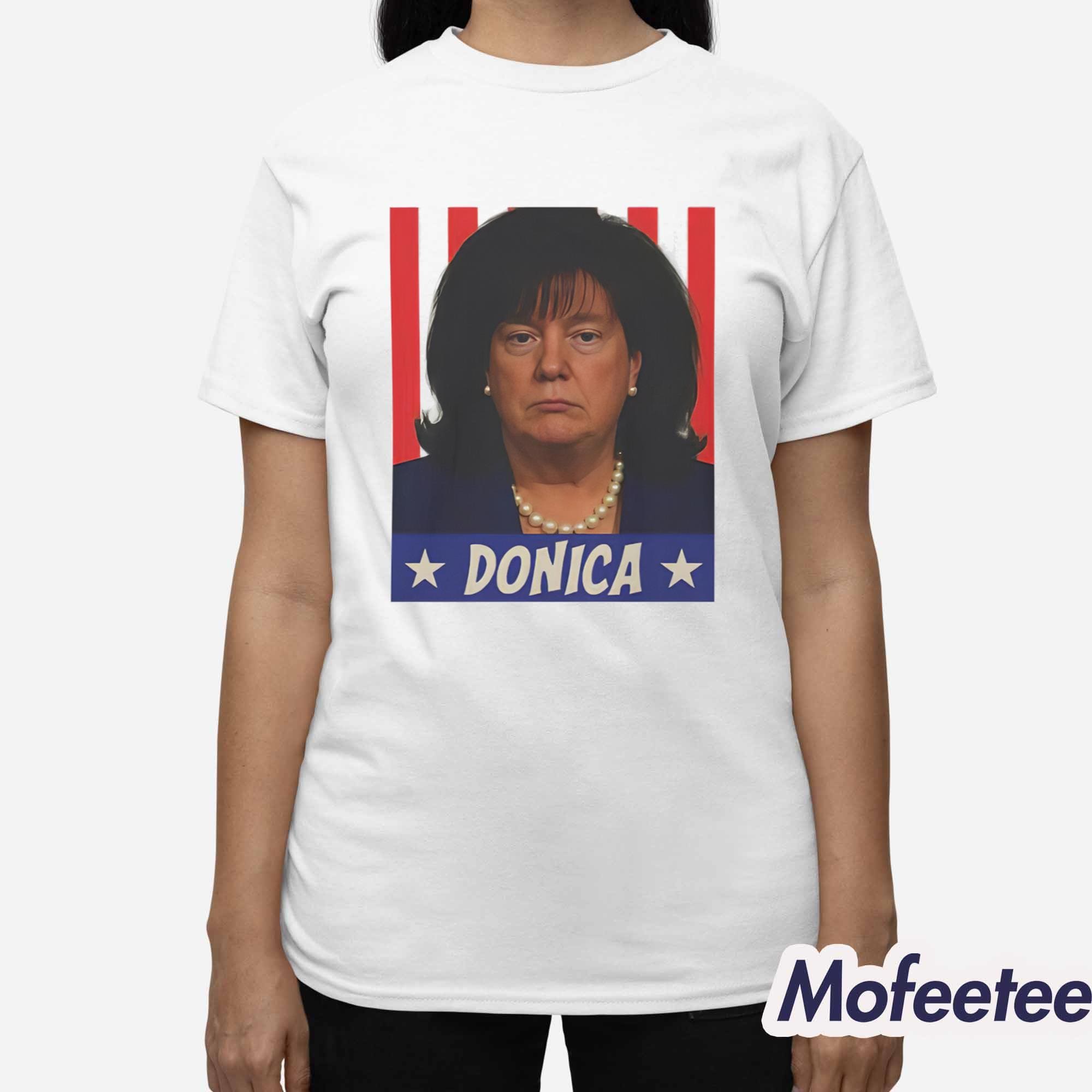 The image itself is a parody of a classic political poster, featuring a stylized portrait of the figure with a strong, confident expression. The text “DONICA” is prominently displayed at the bottom, accompanied by patriotic star accents.