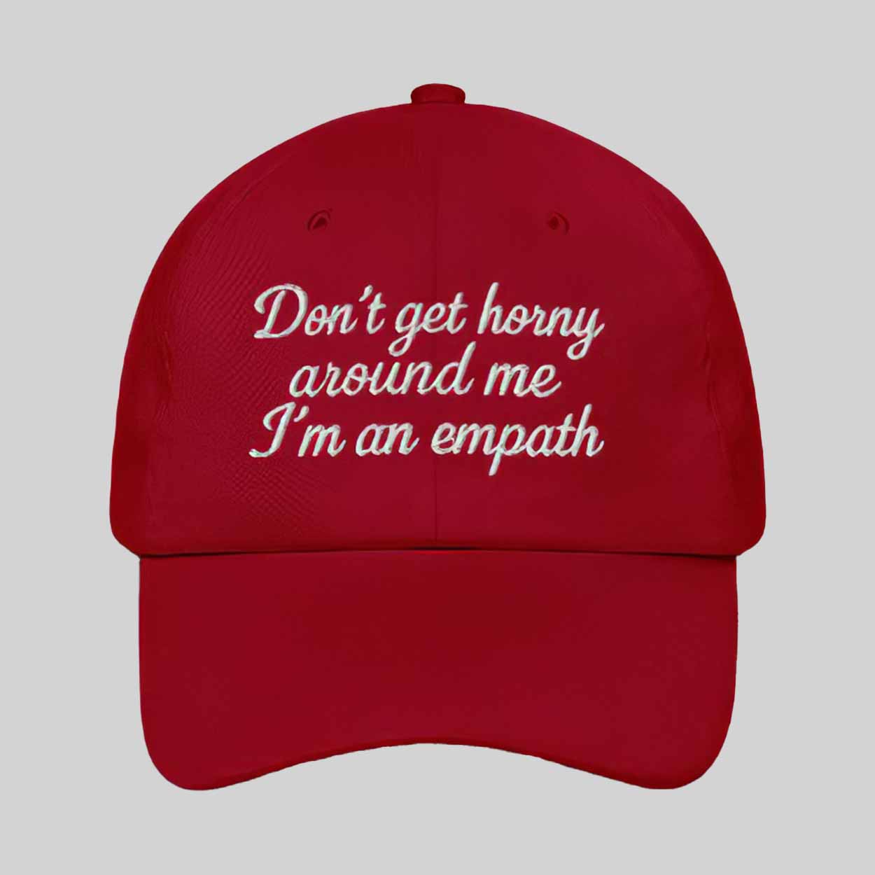 The hat is a classic, black baseball cap featuring a bold white embroidered message. The text “Don’t get horny around me, I’m an empath” is playfully written in an elegant script, offering a humorous and quirky vibe. This cap is perfect for those who want to make a statement without saying a word.