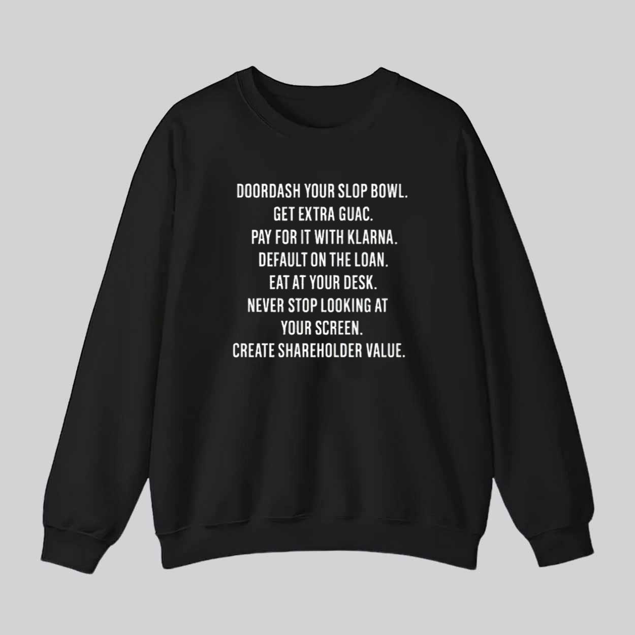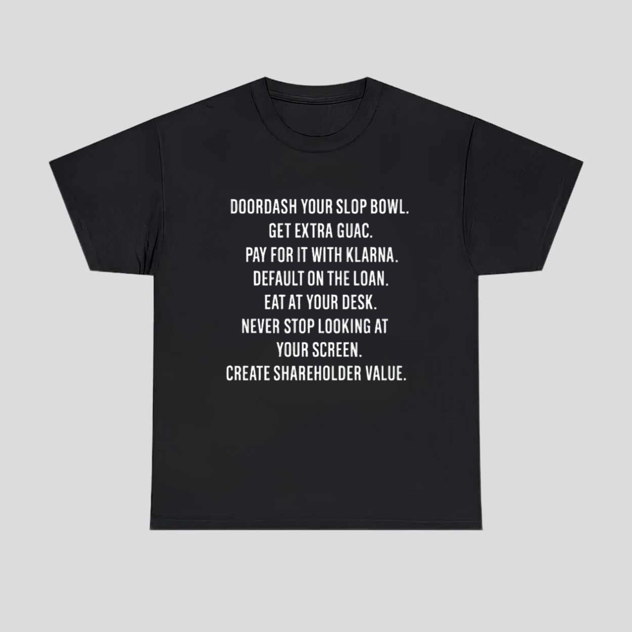 The shirt features a minimalist yet impactful text design printed on the front in crisp white lettering against a solid background. The bold typography showcases lines like “Doordash your slop bowl. Get extra guac. Pay for it with Klarna. Default on the loan.”—a satirical nod to today’s fast-paced consumer and tech-driven lifestyle. The clean layout ensures the message pops, making it easy to read and impossible to ignore.