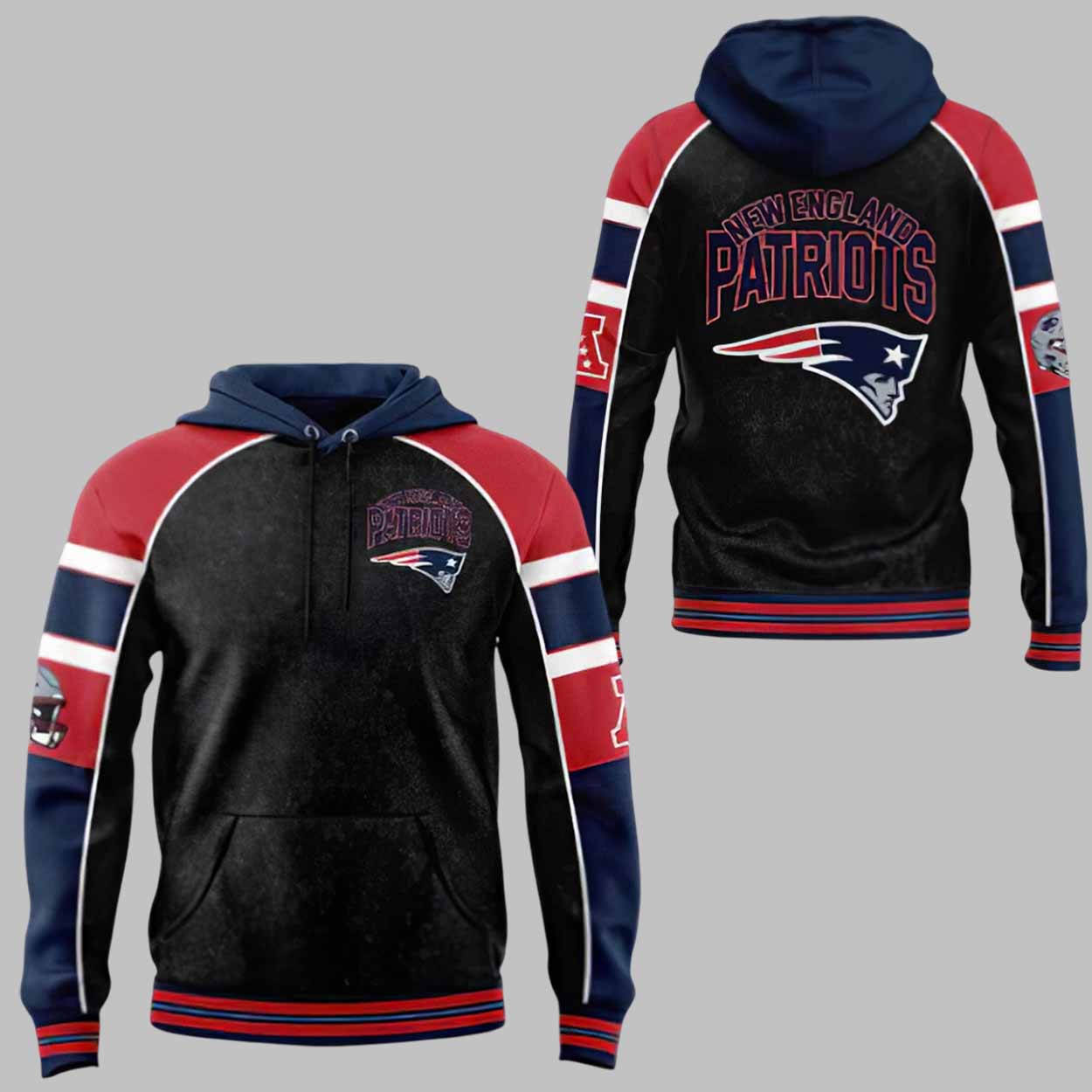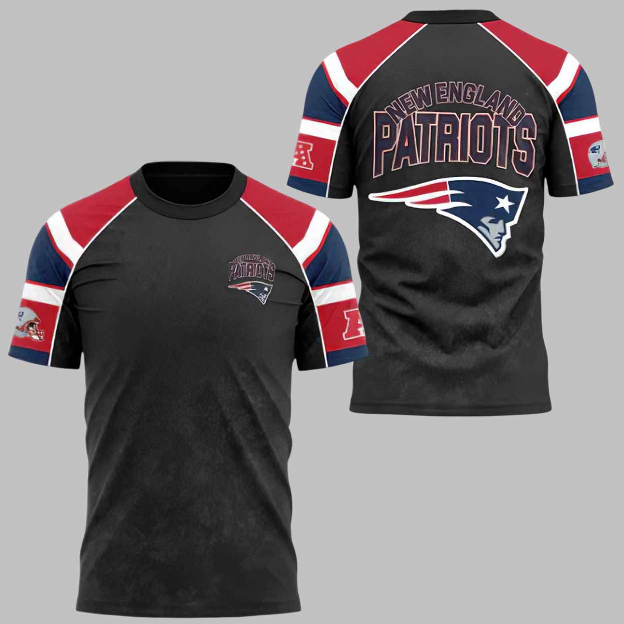 The shirt stands out with a striking old-school aesthetic. The front features a clean Patriots emblem placed over a deep black base, while the sleeves showcase bold red, white, and navy striping that instantly recalls classic New England uniforms. On the back, the large “NEW ENGLAND PATRIOTS” text and iconic team logo take center stage for maximum visual impact. The design is sharp, energetic, and built for fans who love a vintage vibe with a modern twist.