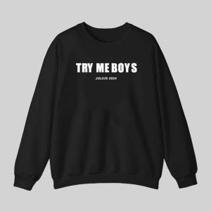 The shirt delivers impact with simplicity. Featuring large, bold white text across the chest that reads “TRY ME BOYS” with “JULIUS 2024” printed right below, this shirt pays tribute to both a rising political moment and the viral energy surrounding it. Whether you wear it to rallies, debates, or just out and about, it sparks conversation and turns heads.
