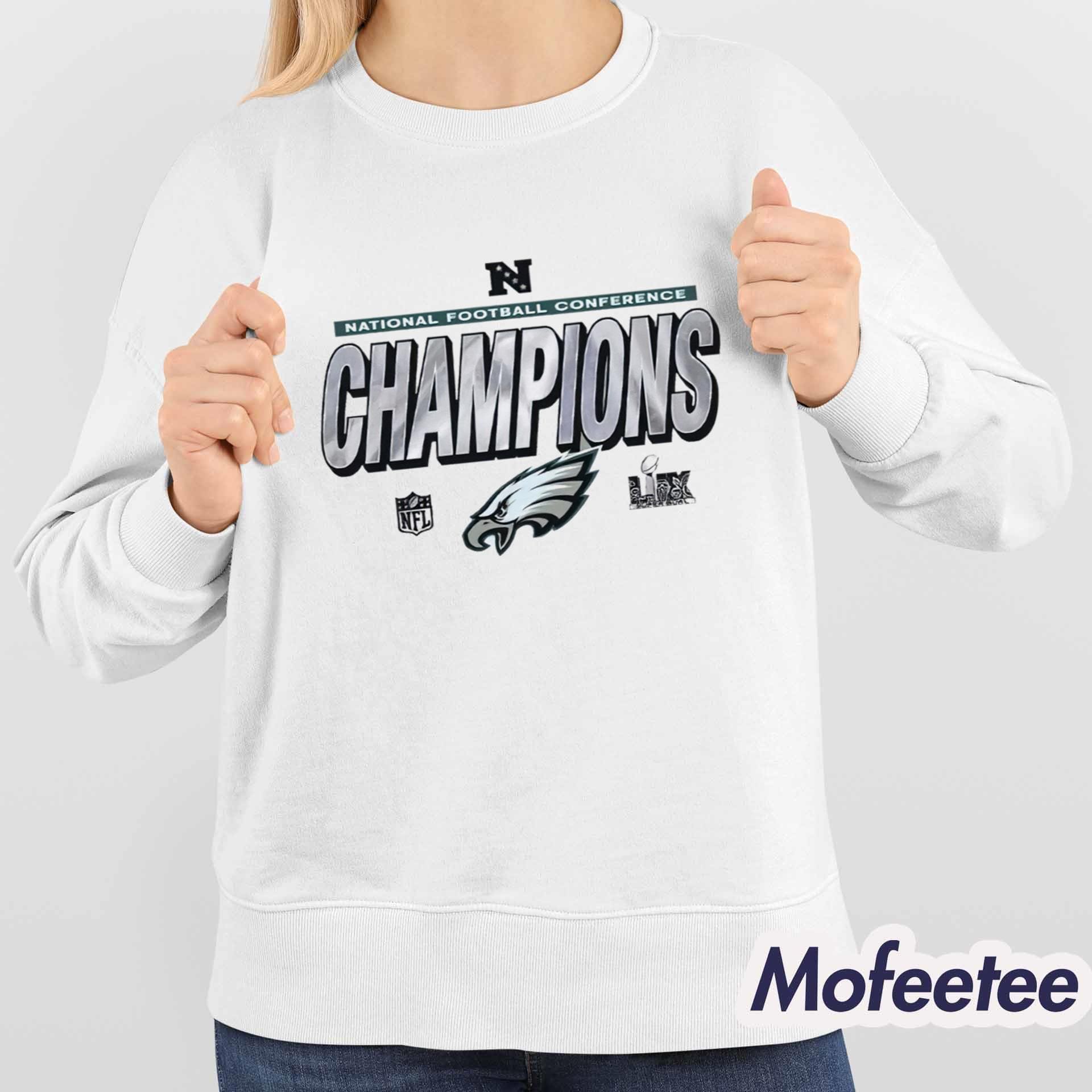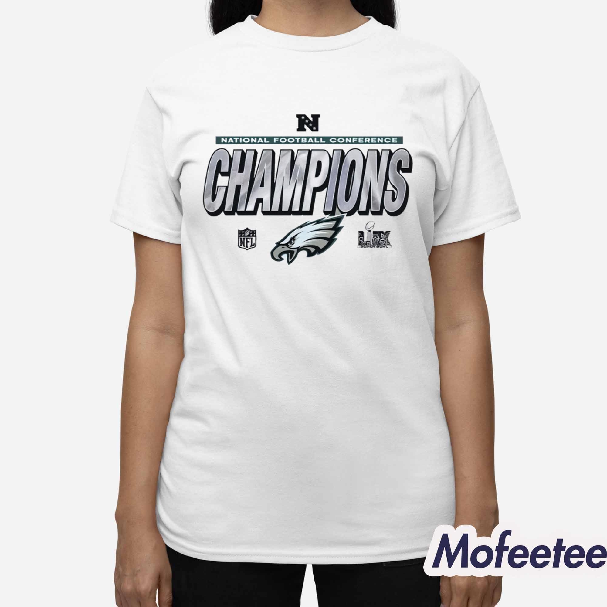 The shirt proudly features the “CHAMPIONS” text in striking silver and green, with the Eagles logo, NFC emblem, and the coveted conference trophy. The clean white background highlights the design, making it a timeless tribute to the team’s achievement.