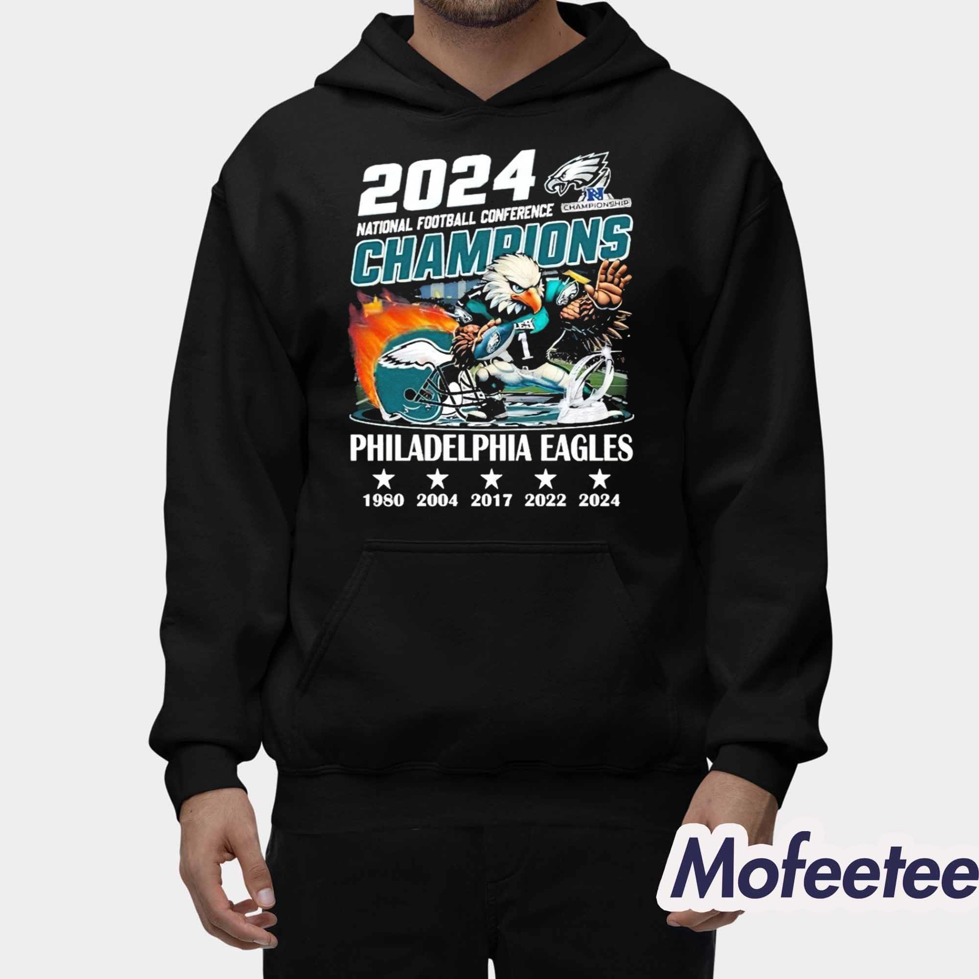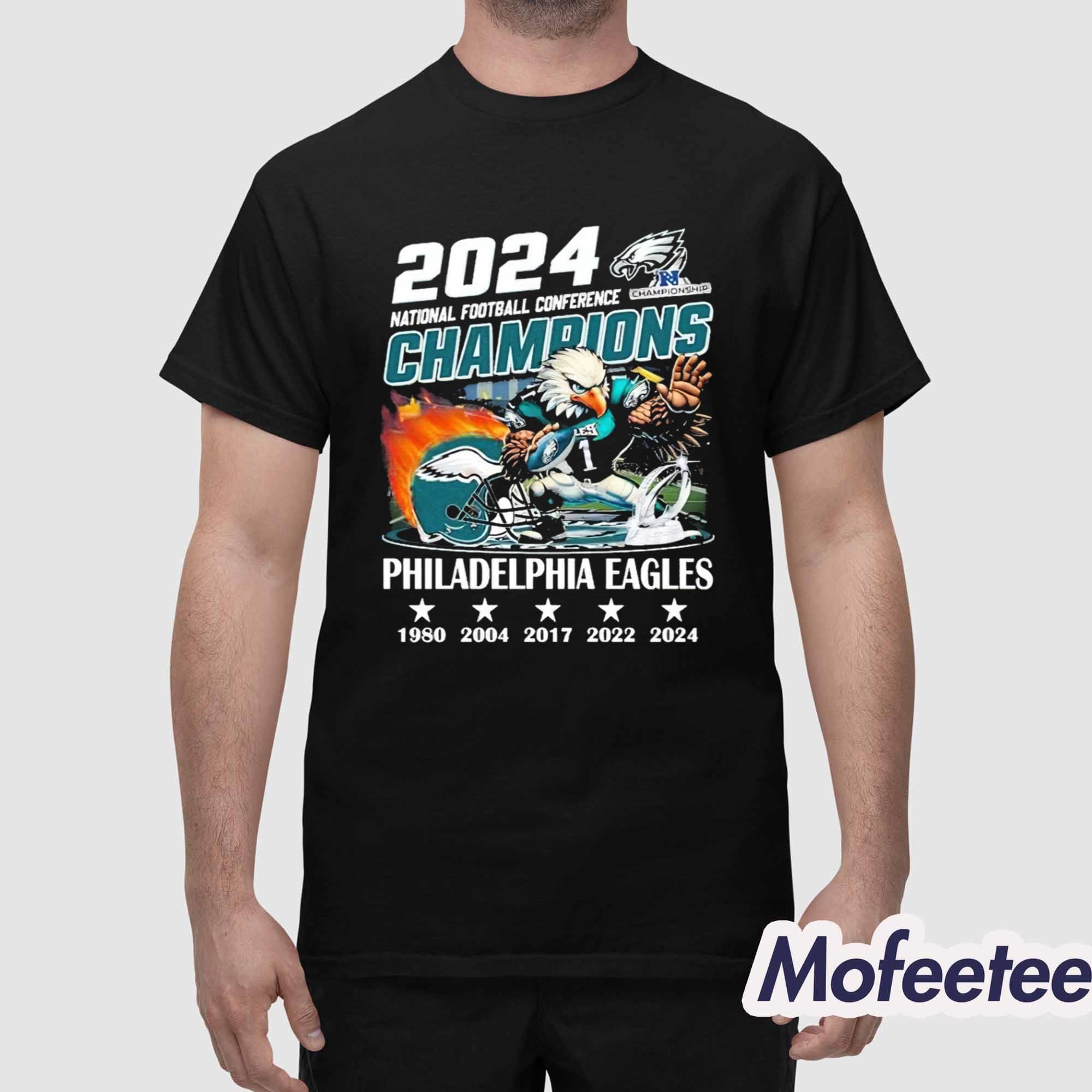 The Eagles National Football Conference Champions 1980 2004 2017 2022 2024 Helmet Mascot Shirt is the ultimate tribute to the Philadelphia Eagles’ legacy of greatness. This shirt highlights the team’s conference championships spanning decades, making it a must-have for every dedicated Eagles fan. With its bold design and historic milestones, this shirt is more than apparel—it’s a celebration of victory.